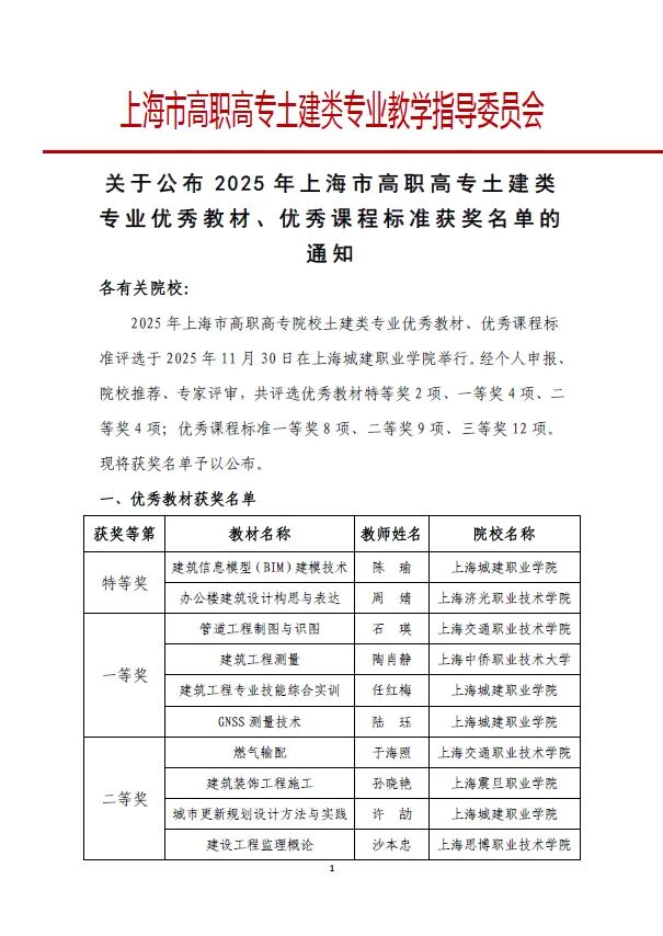 近日,上海市高职高专土建类专业教学指导委员会相继公布了2025 年上海市高职高专土建类专业优质课程(精品在线开放课程)以及优秀教材、优秀课程标准评选结果。我院教师团队在多项评选中表现突出,取得多项重要成果,充分展现了学院在土建类专业建设、课程改革和教学质量提升方面的显著成效。