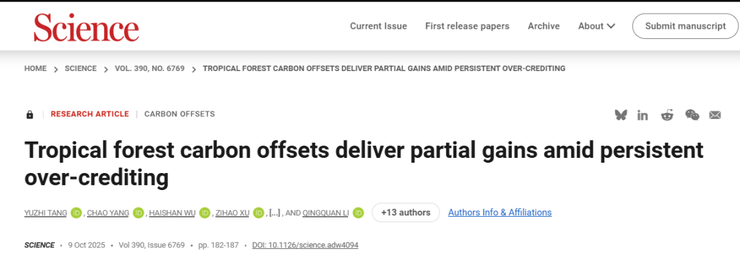 李清泉院士团队提出森林碳抵消评估新方法,破解热带森林碳信用争议难题,研究成果登顶Science;