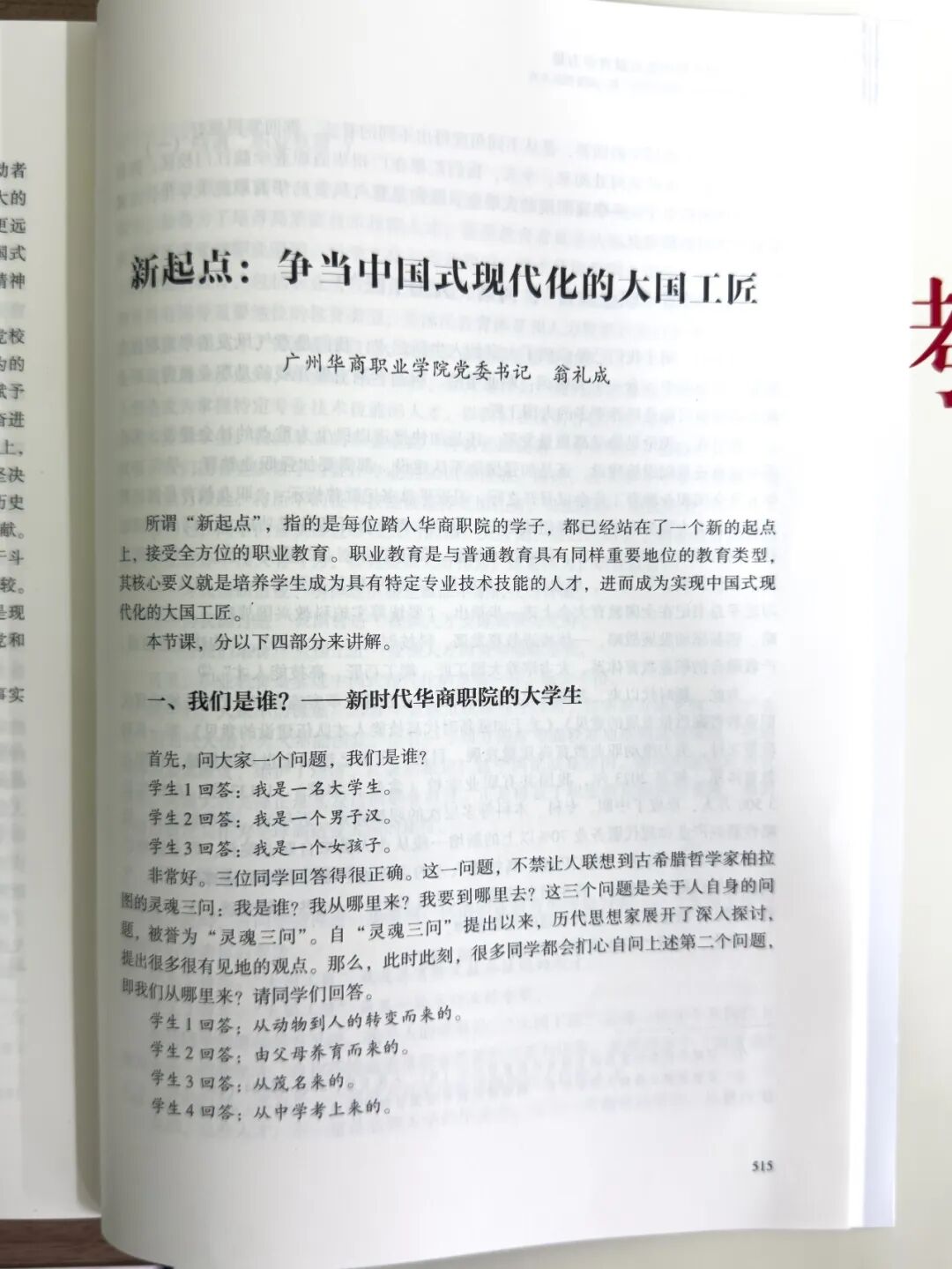 近日,广东省委教育工委、省教育厅组织编印的《广东高校党委书记、校长思政“第一课”精品文集》正式出版。广州华商职业学院党委书记翁礼成教授的思政“第一课”讲稿《新起点:争当中国式现代化的大国工匠》成功入选,充分彰显了学校思政课程建设的扎实基础和育人成效。