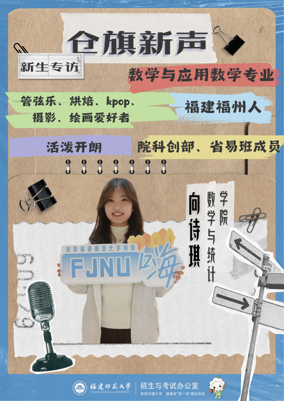 向诗琪:大家好,我是2025级数学与统计学院的新生向诗琪,高中毕业于福建师大附中,现任数学与应用数学2班的学习委员、学院科创部和福建省易班的干事。我的MBTI是“ENFP”,喜欢绘画、烘焙、摄影和kpop。来到师大希望能体验更多不同的生活,找寻热爱,发光发热!