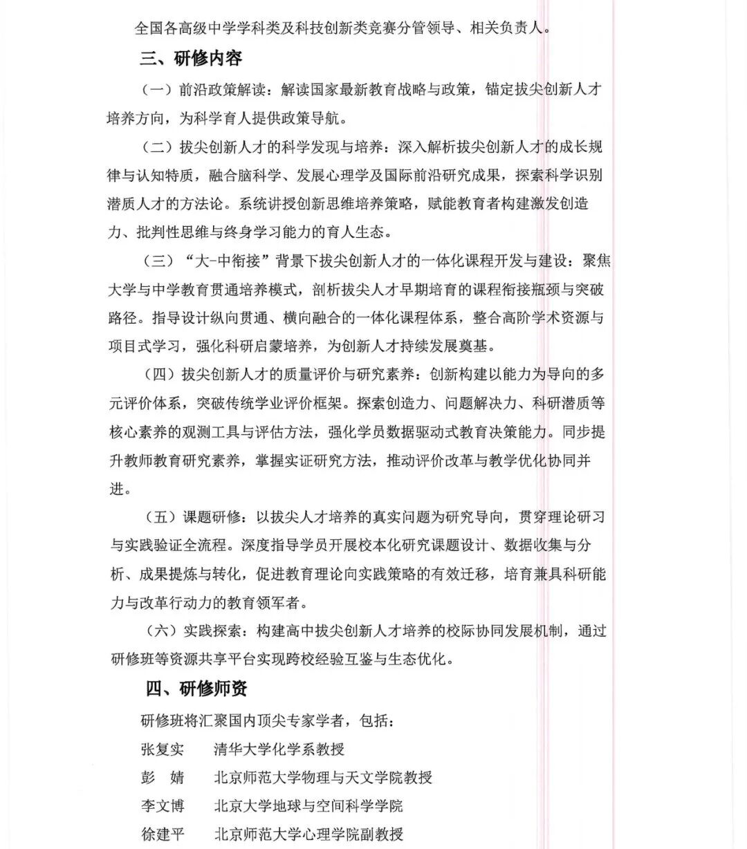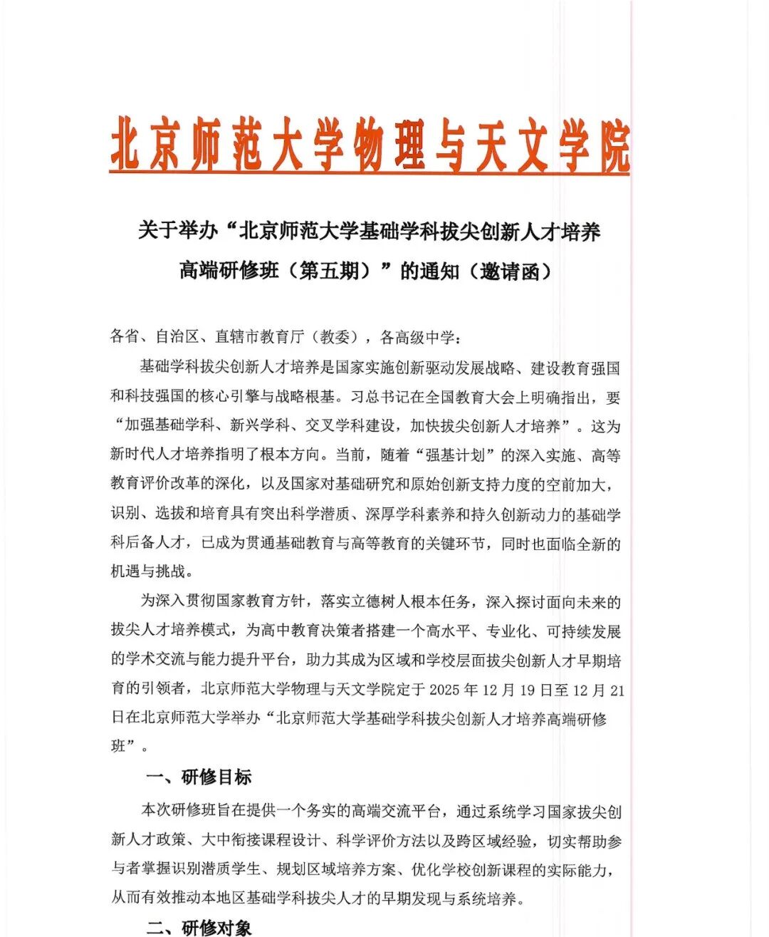 关于举办北京师范大学基础学科拔尖创新人才培养高端研修班(第五期)的通知(邀请函)