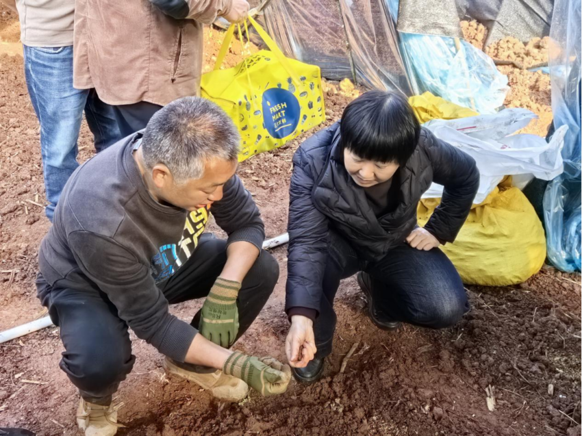 在基地大棚内,谭爱华教授俯身蹲在菌垄间,一边用手感知土壤墒情,一边耐心解释:“土壤湿度要保持在55%左右,过湿会影响菌丝呼吸。”在仔细检查菌棒后,谭教授针对菌丝生长的不同阶段,提出了温度管理和养分补充的具体建议。针对本地冬季气候特点,谭教授对大棚的加固控温提出了具体方案,并特别强调了菌种的低温保存和土壤的病虫害防治。