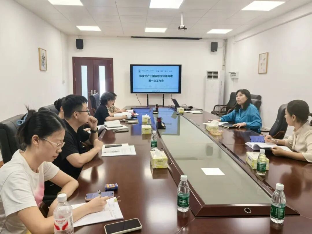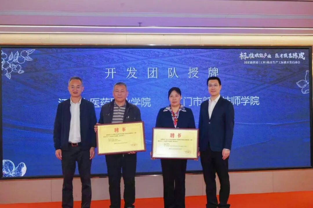 “陈皮生产工”于今年7月正式获批成为国家新职业,是江门首个国家新职业。面对广西、湖南、四川、江西、广东等全国主要柑橘主产区栽培面积广阔、陈皮加工从业群体庞大,但技艺传承断代、现代技术持证率低、季节性用工缺口突出等发展瓶颈,学校主动作为,副校长谭晓玉牵头对接江门市人力资源和社会保障局、新会陈皮行业协会等单位,组建涵盖中药学、食品加工、市场销售等多学科背景的专家团队,多次召开“陈皮生产工”国家职业标准开发专题研讨会,并联合政校企专家,深度参与标准框架搭建、职业技能等级划分、工作内容梳理等关键环节,系统提炼出生产准备、过程控制、研发加工、品质控制、仓储包装、产品销售、培训指导、技术引领共8项核心职业功能,并细化明确24项具体工作内容及关键技能要求,为标准的科学编制积累扎实的一手资料。经多轮研讨与修订,团队成功起草《代用茶加工工(陈皮生产工)国家职业标准》(初稿),获得相关部门和行业的高度认可,为该项国家职业标准的正式出台奠定了良好基础。