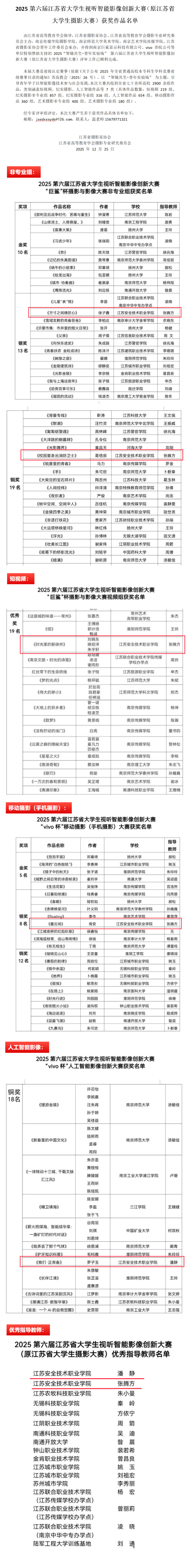 江苏省大学生视听智能影像大赛由原江苏省大学生摄影大赛升级而来,由江苏省高等教育学会指导,江苏省摄影家协会、江苏省高等教育学会摄影专业研究委员会主办,是省级认定赛事。本届大赛以“智镜共生·青年实验场”为主题,引导青年学生以智能影像技术参与社会实践,全省共有70余所高校参赛,2900余组作品参评。我校参赛学生以光为媒,巧妙运用光影,用镜头记录生活点滴,展现学校特色发展成果。本届比赛全赛道均斩获奖项,实现奖项等级和数量跃升,是继第四届大赛张申同学获得优秀奖、第五届大赛胥安同学获得铜奖后的新突破,充分展示了学校扎实做好校园文化和网络思政工作的新成绩。