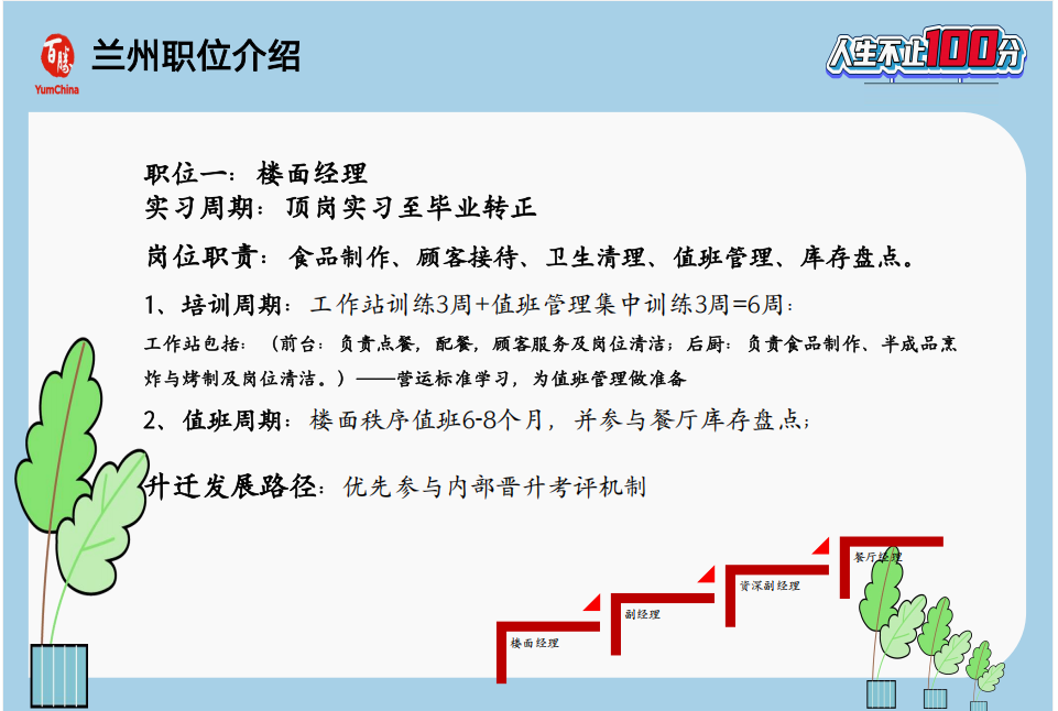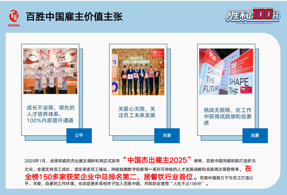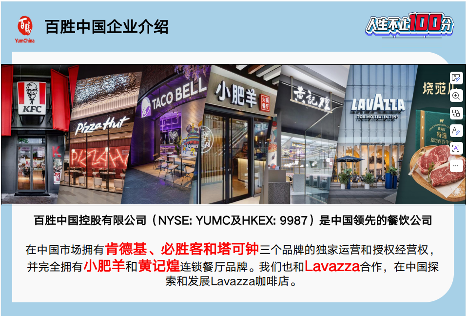 百胜中国控股有限公司(肯德基母公司),是中国领先的餐饮企业,致力于成为全球最创新的餐饮先锋。自从1987年第一家餐厅开业以来,百胜中国在中国的足迹遍布所有省市自治区(港澳台除外),在2,000多座城镇经营着15,000多家餐厅。百胜中国在中国市场拥有肯德基、必胜客和塔可钟三个品牌的独家运营和授权经营权,并完全拥有小肥羊和黄记煌连锁餐厅品牌。经过三十多年的发展,我们不仅在店面数量方面,而且在品牌知名度、社交及数字媒体营销和传播、全国供应链管理、产品质量、以及创新方面都已经成为了一家中国领先的餐饮企业。百胜中国超过40万的员工是我们发展的支柱,与此同时,在百胜积累了经验丰富的管理团队和全情投入的前线伙伴也正在继续引领发展活力充沛、直面机遇、和充满欢乐的企业文化。