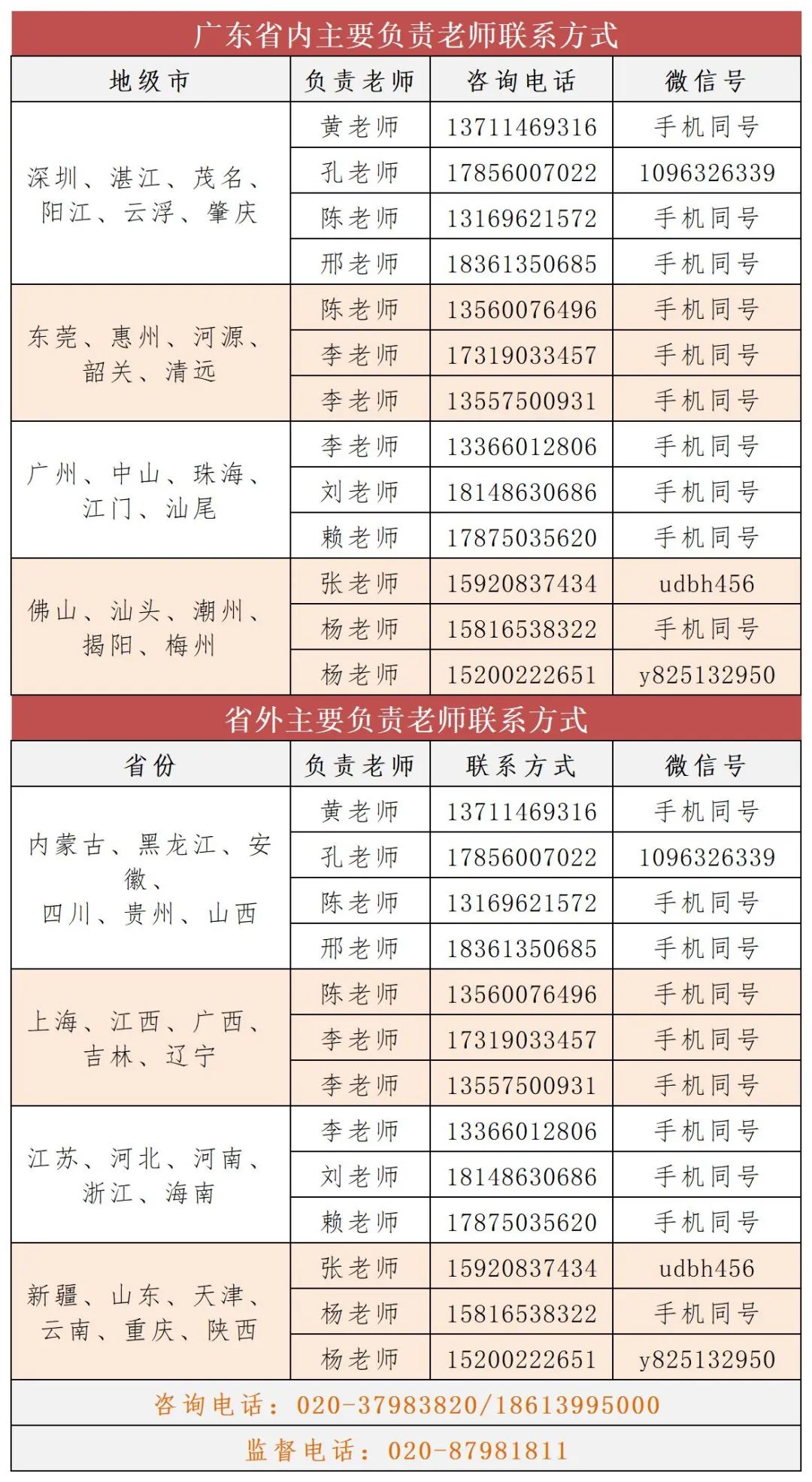 各省招生老师联系方式