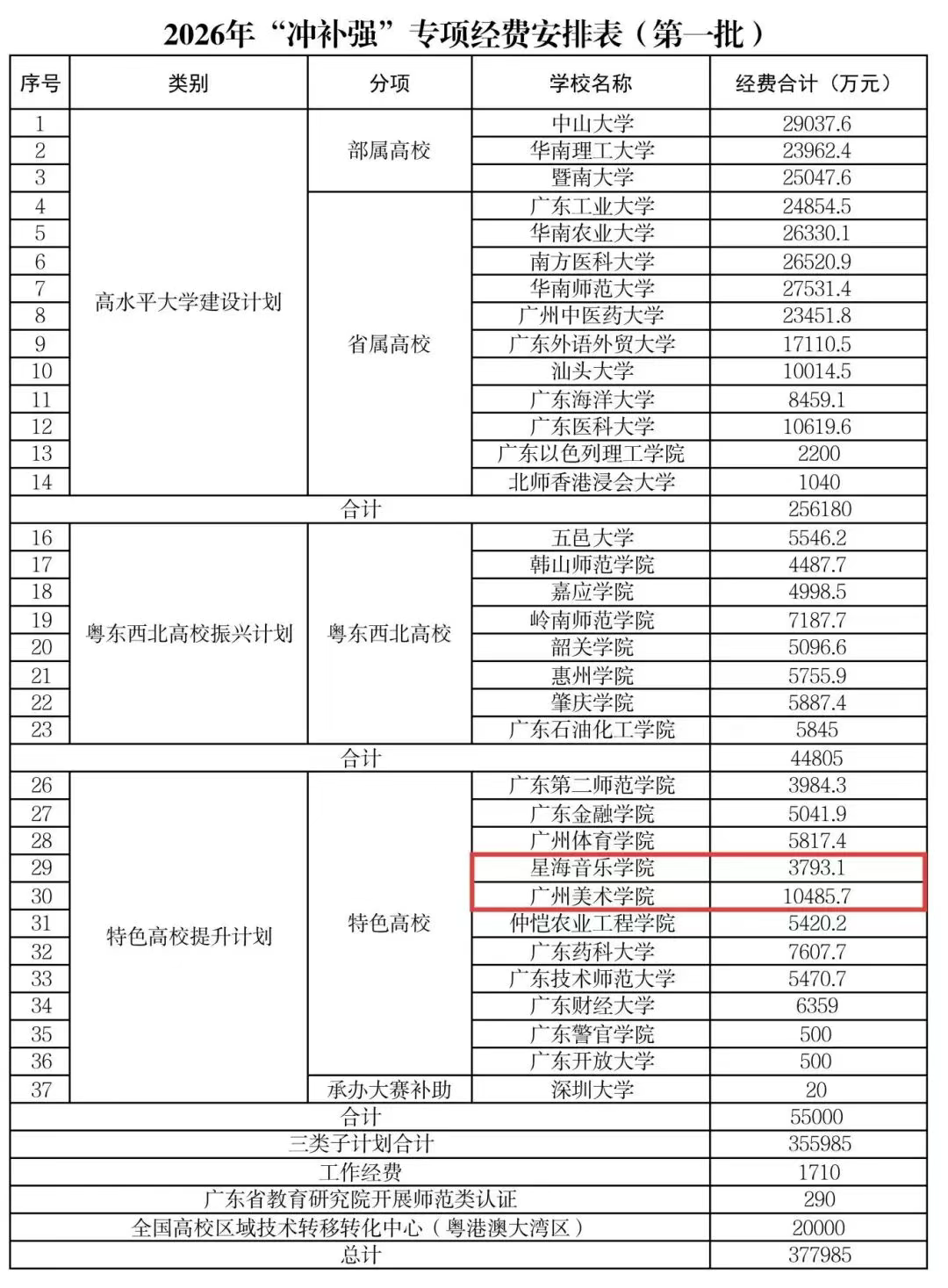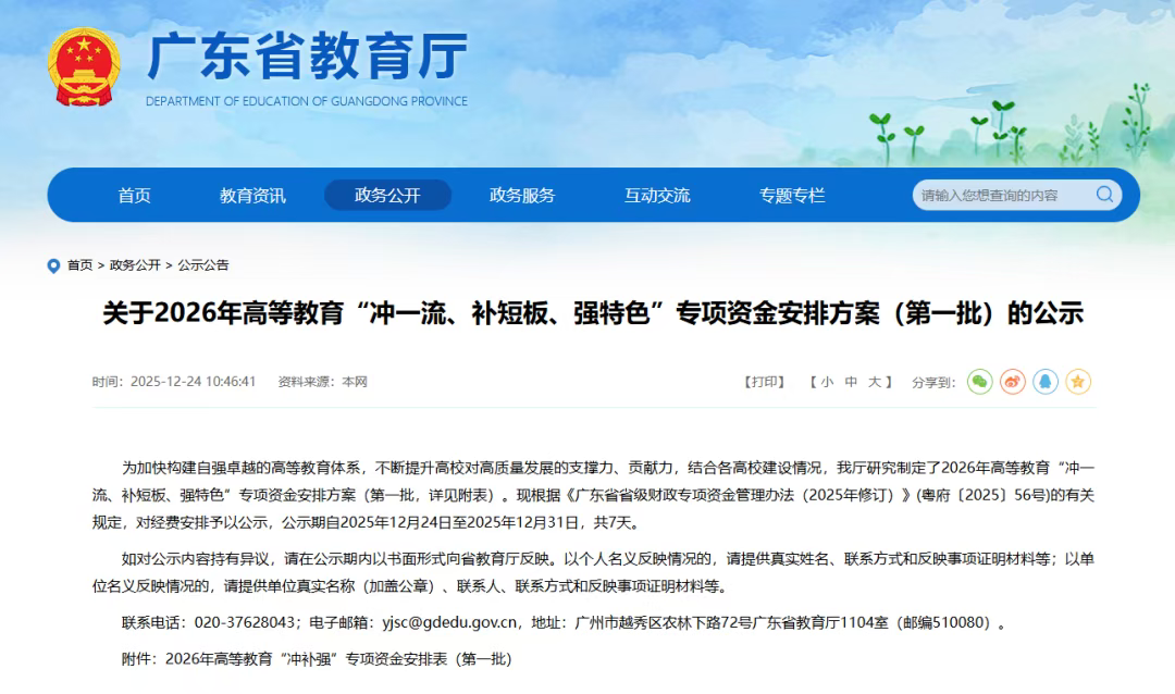12月24日,广东省教育厅发布了关于2026年高等教育“冲一流、补短板、强特色”专项资金安排方案(第一批)的公示。