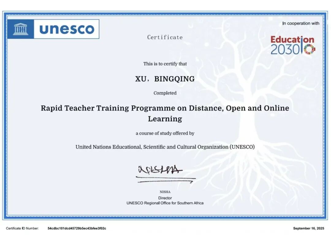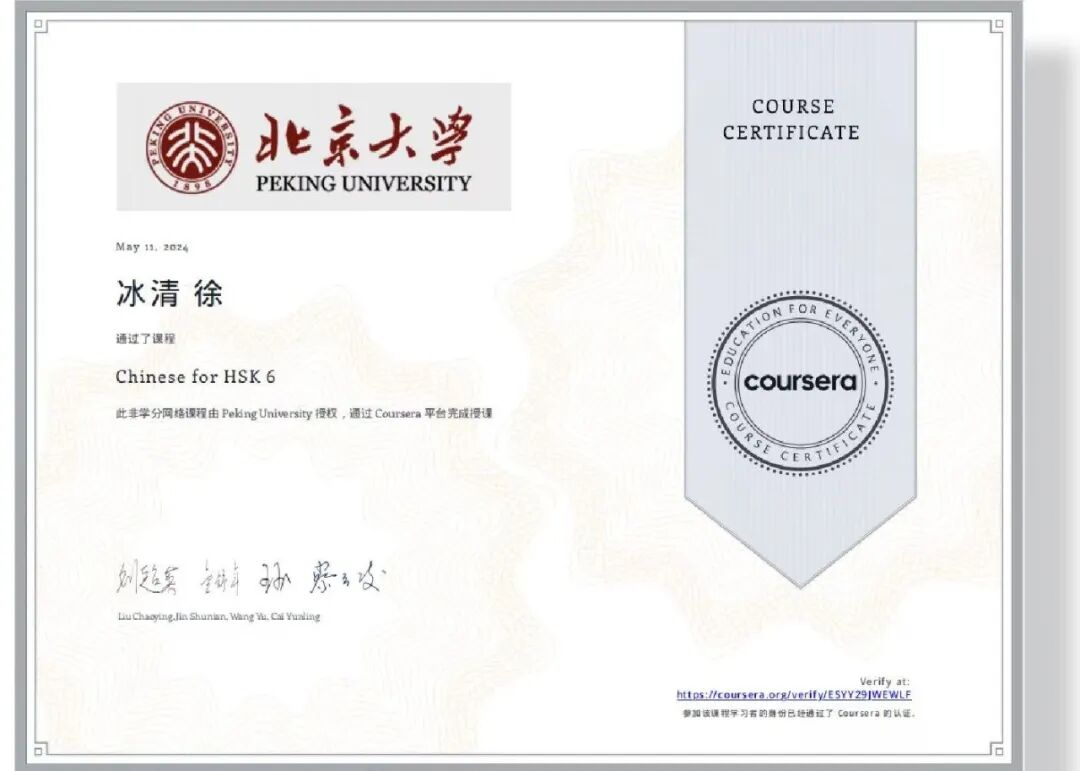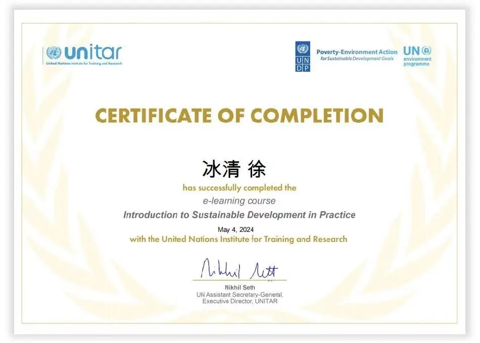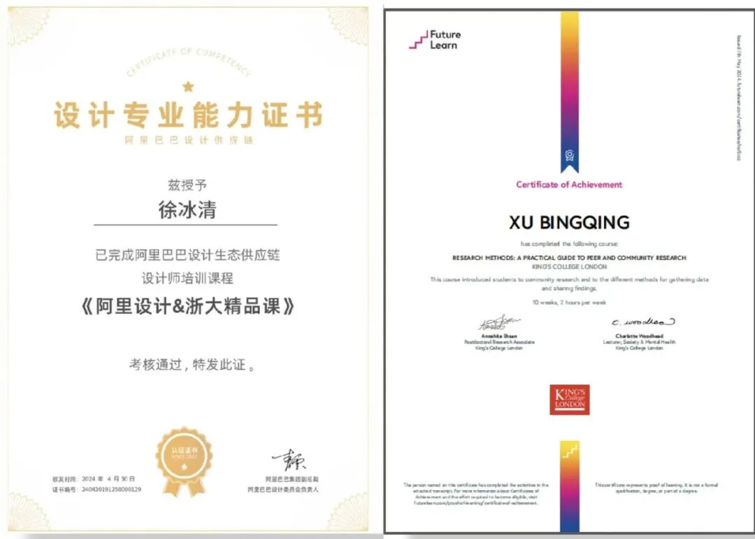 与此同时,她持续进行跨领域能力补充,先后完成并获得7项国内外专业证书,涵盖人工智能、教育、心理学、ESG与设计等方向,包括伦敦国王学院心理学证书、联合国ESG证书、ILO人工智能大师证书、北京大学HSK-6证书等。