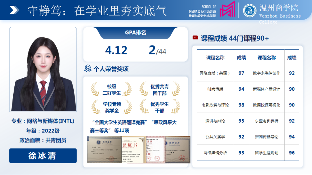 在网络与新媒体专业学习中,她曾任职班级团支书、现任班级学习委员,保持高度自律与稳定投入,平均成绩90分以上,GPA达4.12,专业排名第2,44门课程中多门成绩位列90+。获多次优秀学生综合奖学金。