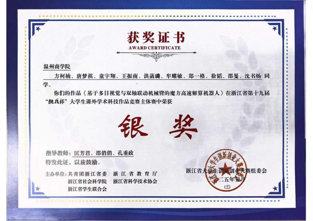 凭借扎实的专业能力与默契的分工协作,他在科创赛场稳步前行:2024 年参与《阳光伴晚霞》项目获省国际大学生创新大赛院赛一等奖,2025 年再获该赛事校赛银奖,更在浙江省第十九届 “挑战杯” 主体赛中斩获银奖,充分展现了信工学子 “IT + 商科” 融合创新的硬核实力。“团队的力量在于互补,每个人都是一块拼图,缺一不可。”这是他对协作的深刻体悟。