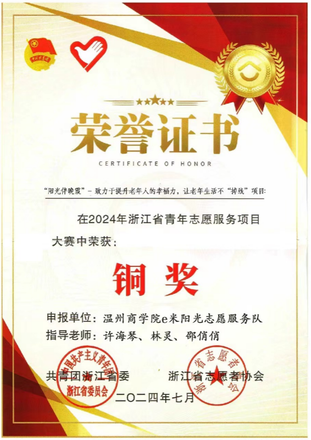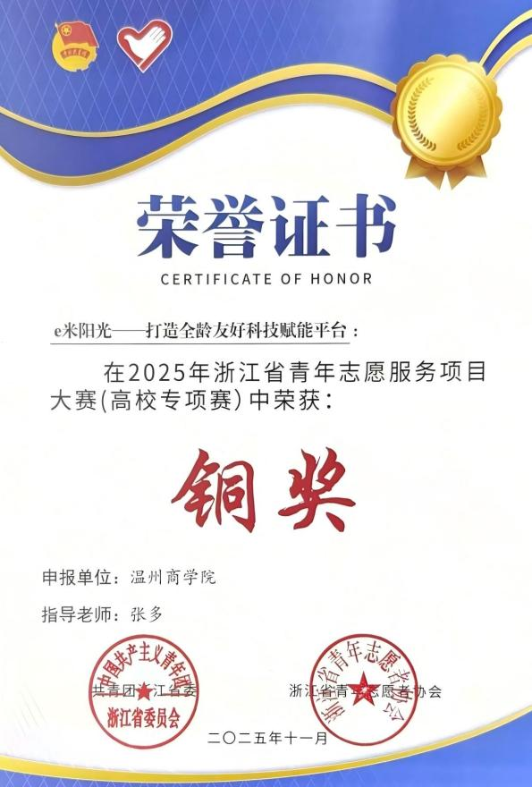 他还带领团队深耕公益项目,连续两年斩获浙江省青年志愿服务项目大赛铜奖,让“e米阳光”的温暖辐射到更广阔的领域。这份扎根基层、脚踏实地的志愿服务精神,正是他实干底色的生动诠释。