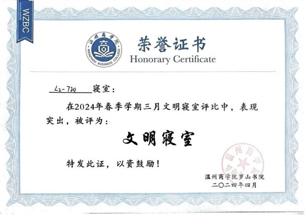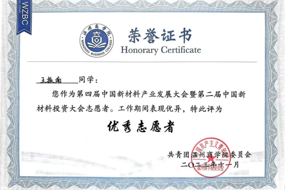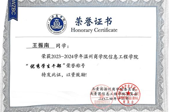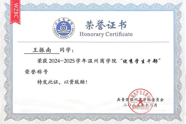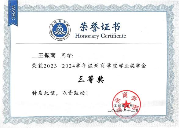 实干的精神,让王振南在学习与生活中也收获满满。他始终坚持“学习与工作双线并重”,在课堂上严谨认真,在课后深耕专业,平衡好学习与学生工作的关系,凭借扎实的学习态度获得温州商学院学业奖学金三等奖。