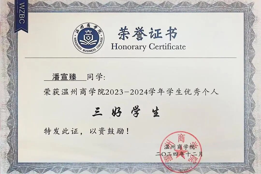 “事事尽心力”,这六个字是潘宣臻作为班级生活委员的工作准则,更是他践行责任的真实写照。他始终把同学们的需求放在心上,主动配合辅导员开展查寝工作,全力搭建起师生沟通的“桥梁”。他还积极参加各类学科竞赛,均取得不错的成绩。