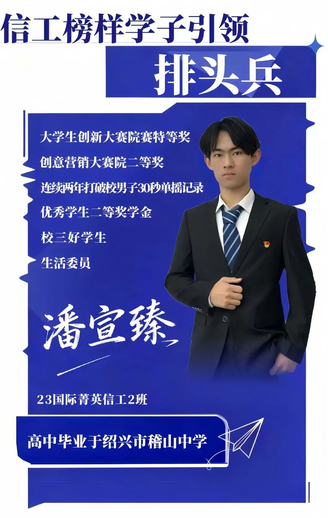 从赛场王者到学习先锋,从贴心班委到发展对象,潘宣臻用“坚持”与“责任”勾勒出新时代大学生的奋进模样,也成为了信工学子心中当之无愧的“排头兵”,未来他将在海外留学的道路上,走出自己的“人生坦途”。