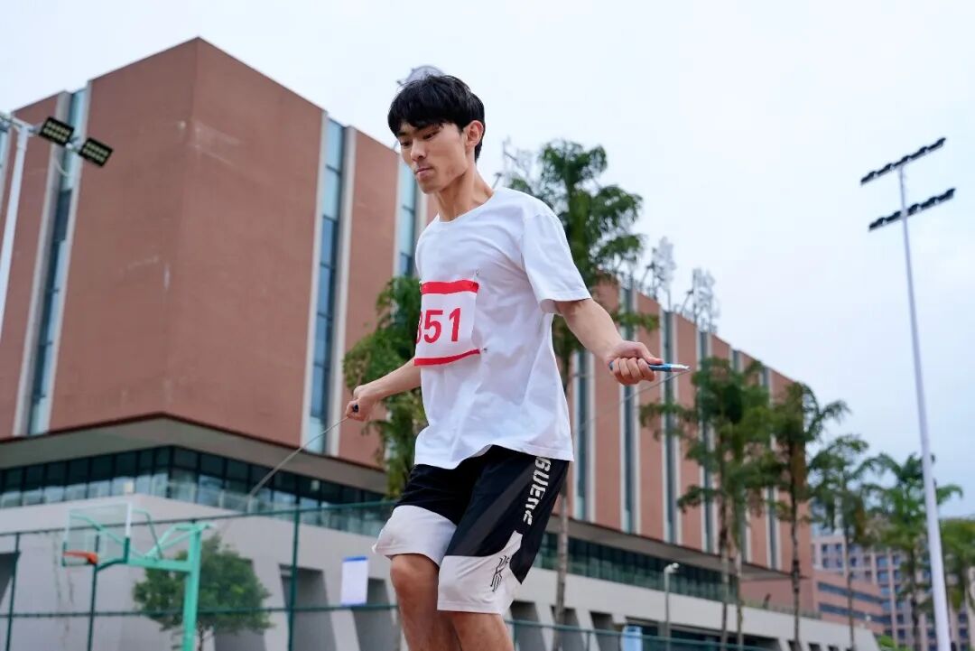 十一月的校运会赛场上,30秒单摇跳绳项目的起点处,气氛已然拉满。随着裁判员一声清脆的哨响,潘宣臻俯身、握绳、发力,一气呵成。绳与地面撞击出密集而规律的“哒哒”声,裹挟着赛场边此起彼伏的加油声,织成一段紧张又热烈的节奏。