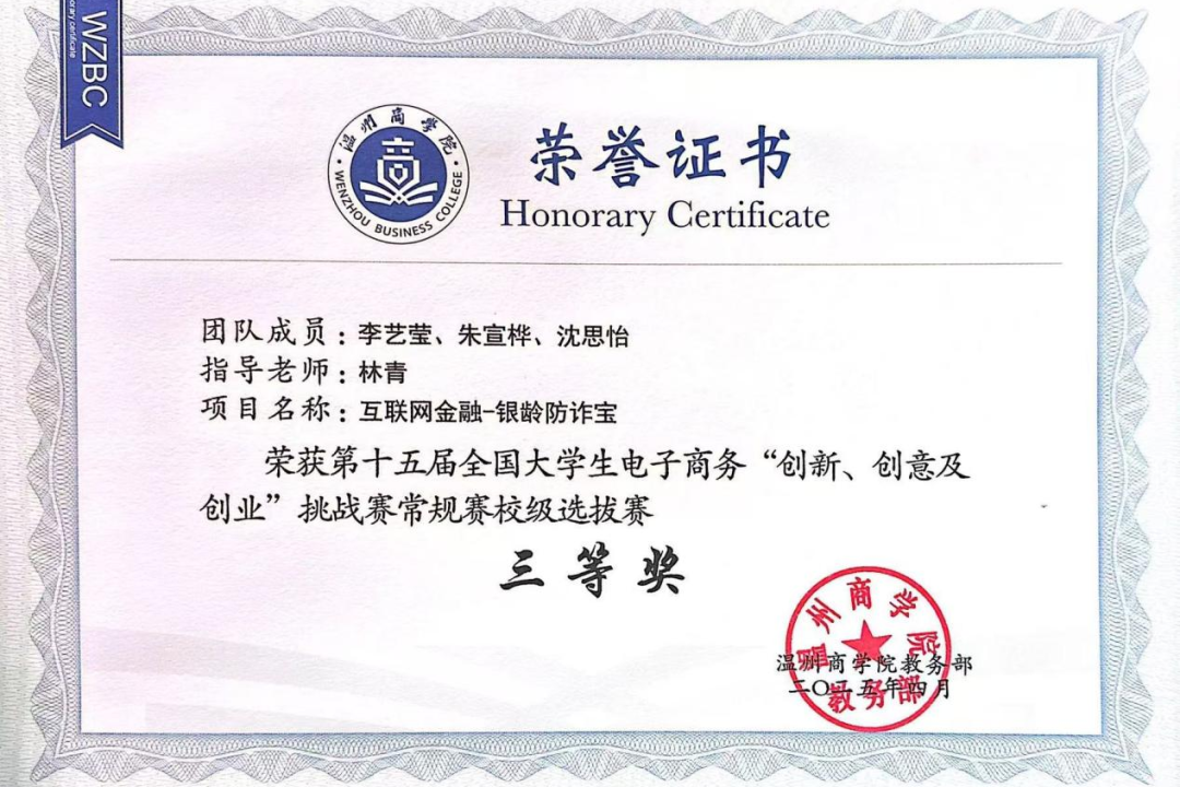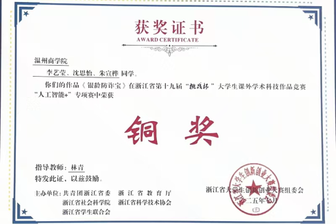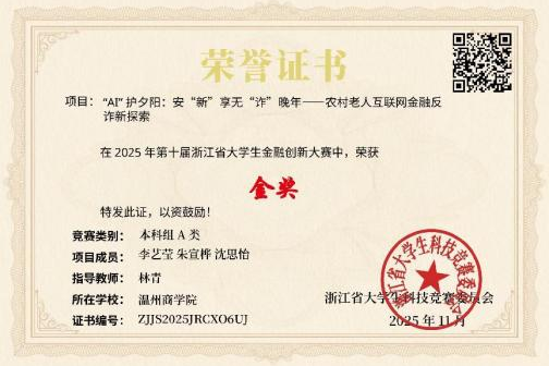 学科竞赛是检验学识与能力的重要舞台,她从未停下探索的脚步,在林青老师的悉心带领下,她一路披荆斩棘,斩获浙江省金融创新大赛金奖、"挑战杯"省级铜奖、全国人工智能应用创新大赛二等奖等诸多荣誉,在实战中锤炼创新思维与协作能力。