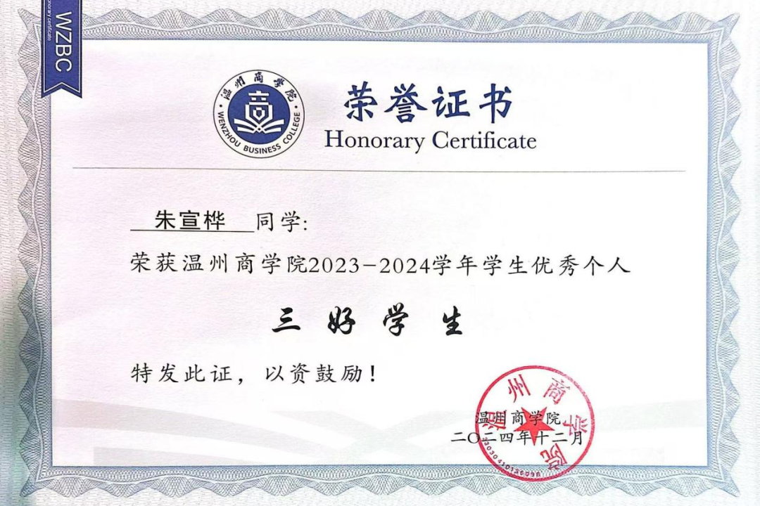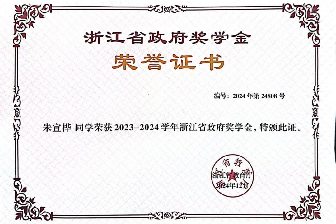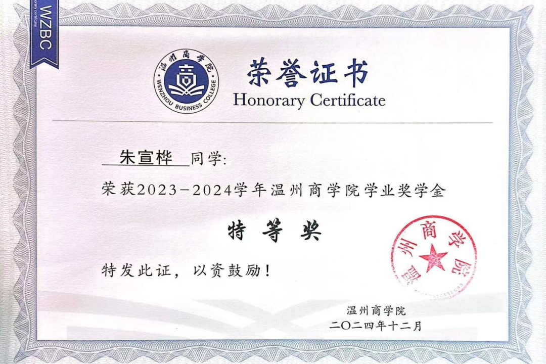 长风劈波斩浪需先积蓄力量,青年绽放芳华当以学业筑牢根基。入学以来,朱宣桦以学习为核心,深耕金融专业,勤耕不辍汲取知识养分。大一、大二平均绩点稳居年级前1%,连续两年班级第一,27门课程达90分以上,斩获2023-2024学年浙江省政府奖学金、学业奖学金特等奖。成绩背后是她深夜苦读的坚持、课堂专注的投入与对学问的精益求精。同时,她主动拓展能力边界,顺利通过英语四六级、计算机二级,完善知识体系,夯实应对未来挑战的底气。