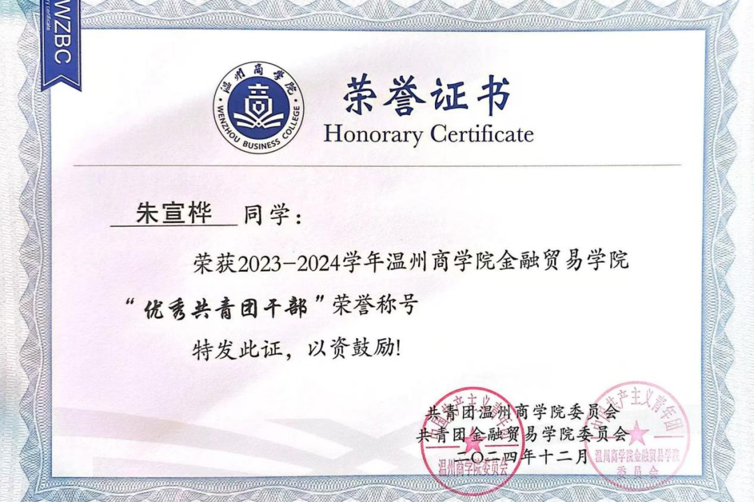 两载春秋流转,从共青团员到中共预备党员,从学业争优到党团践责,从校园学习到社会实践,朱宣桦在温州商学院的沃土上完成了一次又一次的蜕变,收获了成长与荣光。她始终坚守着"步履不停,终见光芒"的信念,在追求理想的道路上从未停歇,这份坚守让她在青春的赛道上跑出了属于自己的最好成绩。