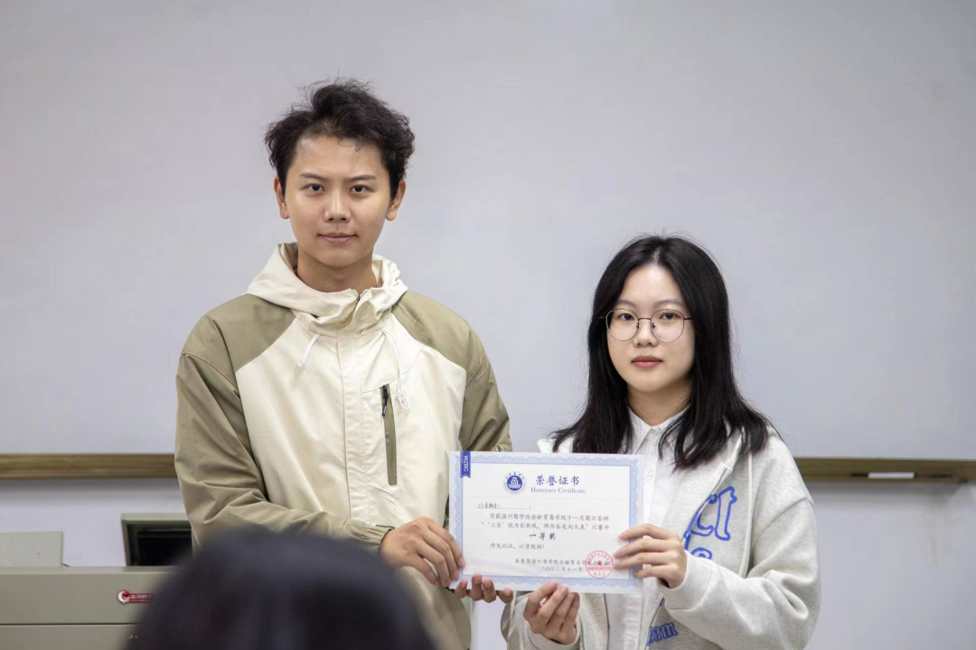 作为学生党建·创先争优发展岗负责人,她日常承担党员档案整理、发展对象答辩大会举办、线上党组织关系转接等工作,始终以严谨细致态度对待每一项琐碎事务。大一暑假,为保障毕业生党员档案顺利移交,她与部门伙伴封装档案至凌晨4点,虽满身疲惫,却因能为组织建设添砖加瓦倍感充实自豪。团学与党建工作积累的实践经验,让她深刻领悟温商院育人根本,始终以“党建引领”为核心,推动党团一体化建设走深走实,自身的责任与担当也在服务他人、奉献集体中不断升华。