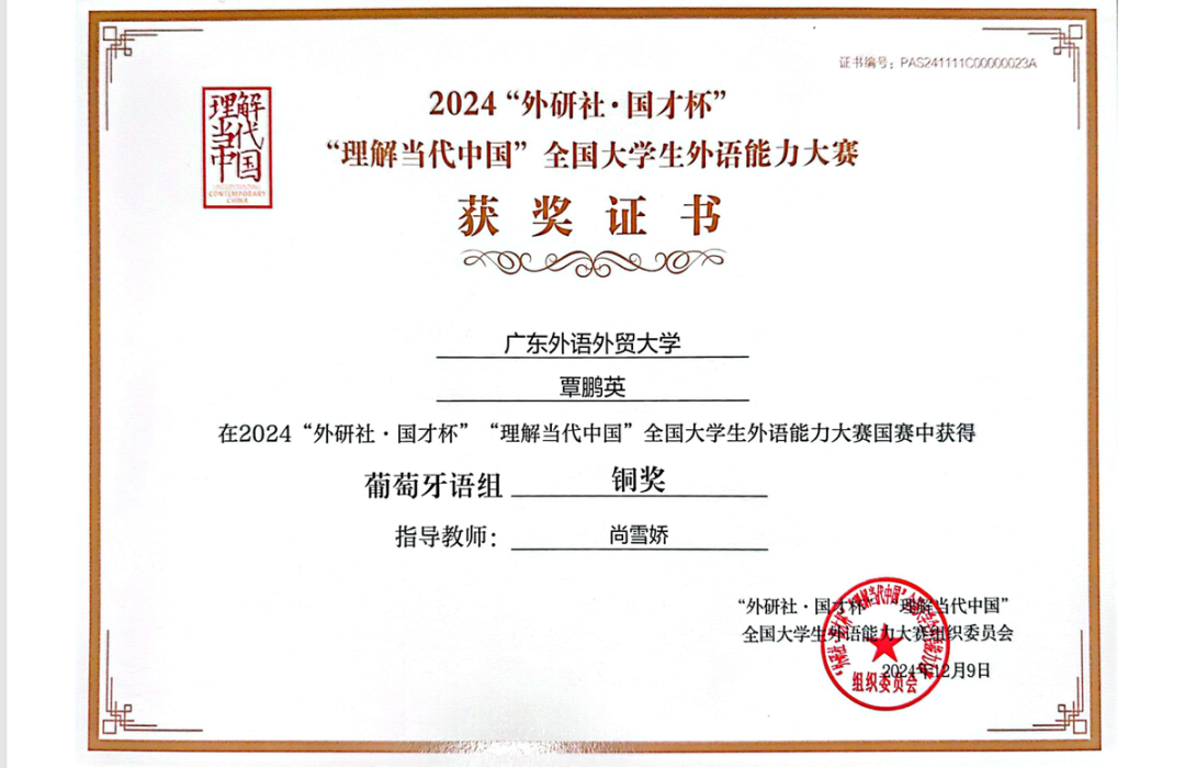 获2022-2023学年广东外语外贸大学“优秀共青团员”、2024-2025学年广东外语外贸大学三等奖学金、2024“外研社·国才杯”“理解当代中国”全国大学生外语能力大赛国赛葡萄牙语组铜奖