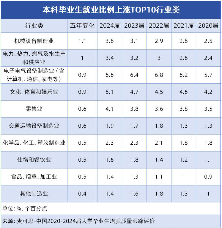 一、本科毕业生就业比例上涨TOP10行业类