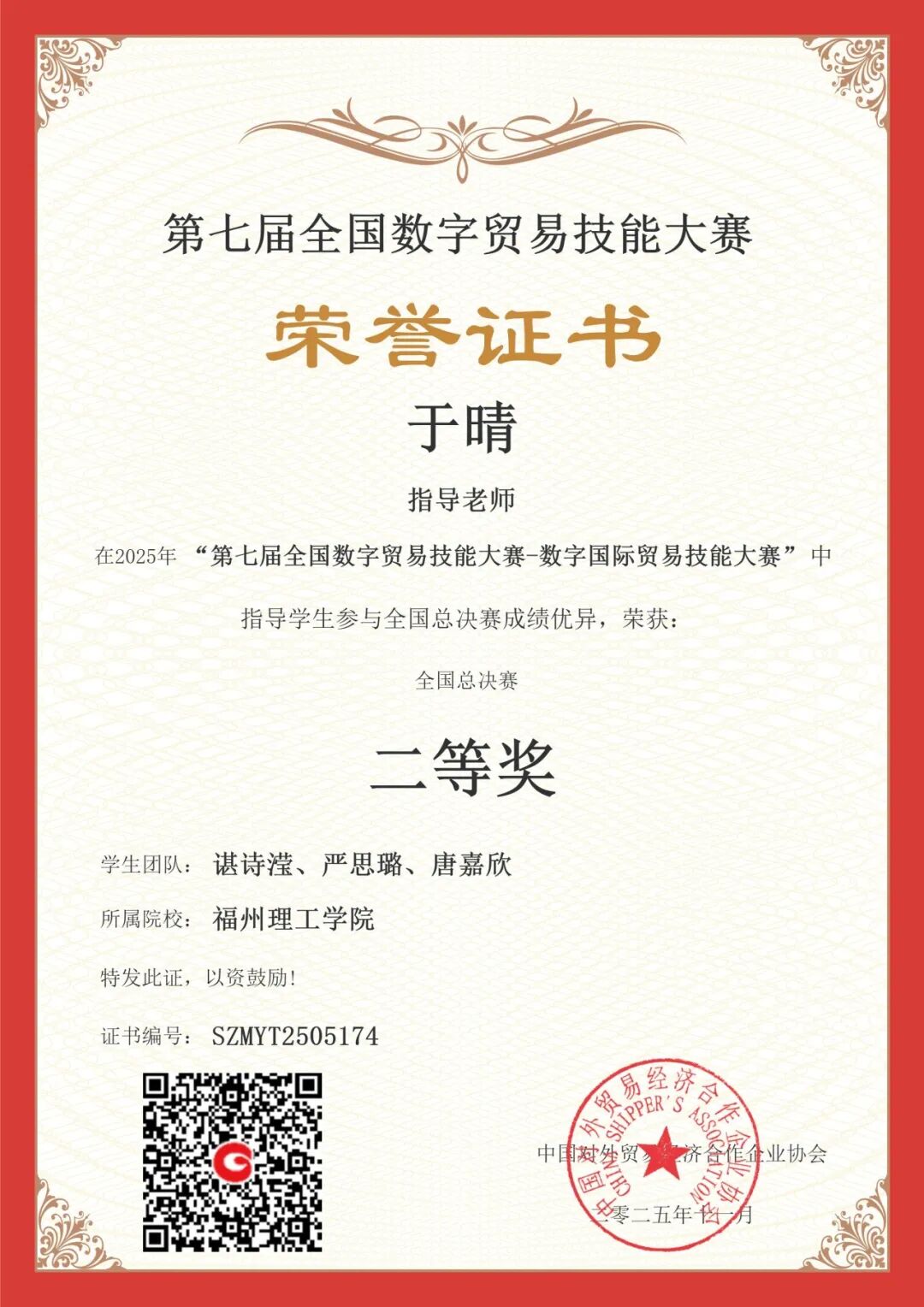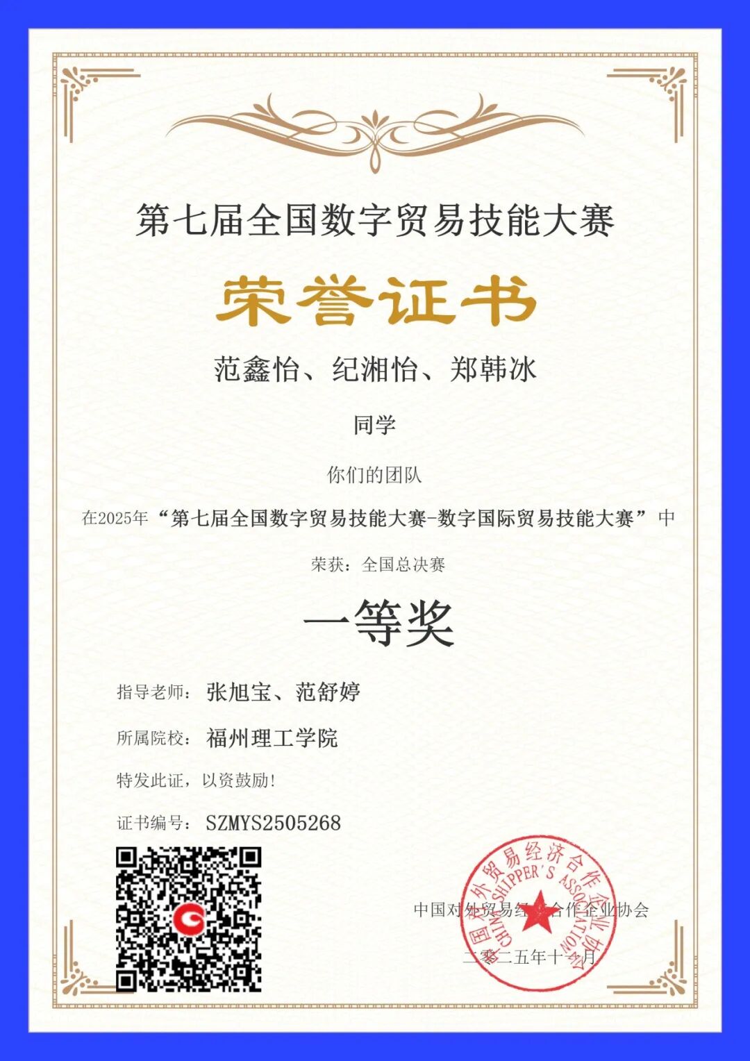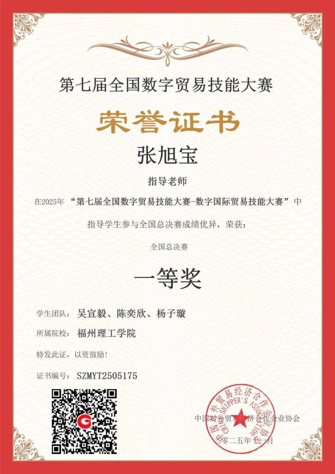 近日,第七届全国数字贸易技能大赛——国际贸易技能赛项国赛圆满落幕,福州理工学院经济管理学院团队共荣获本科学生组团队一等奖2个、二等奖2个,教师组个人二等奖1个,其中2024级国际经济与贸易专业学生范鑫怡、纪湘怡、郑韩冰团队以优异表现跻身全国第六名。