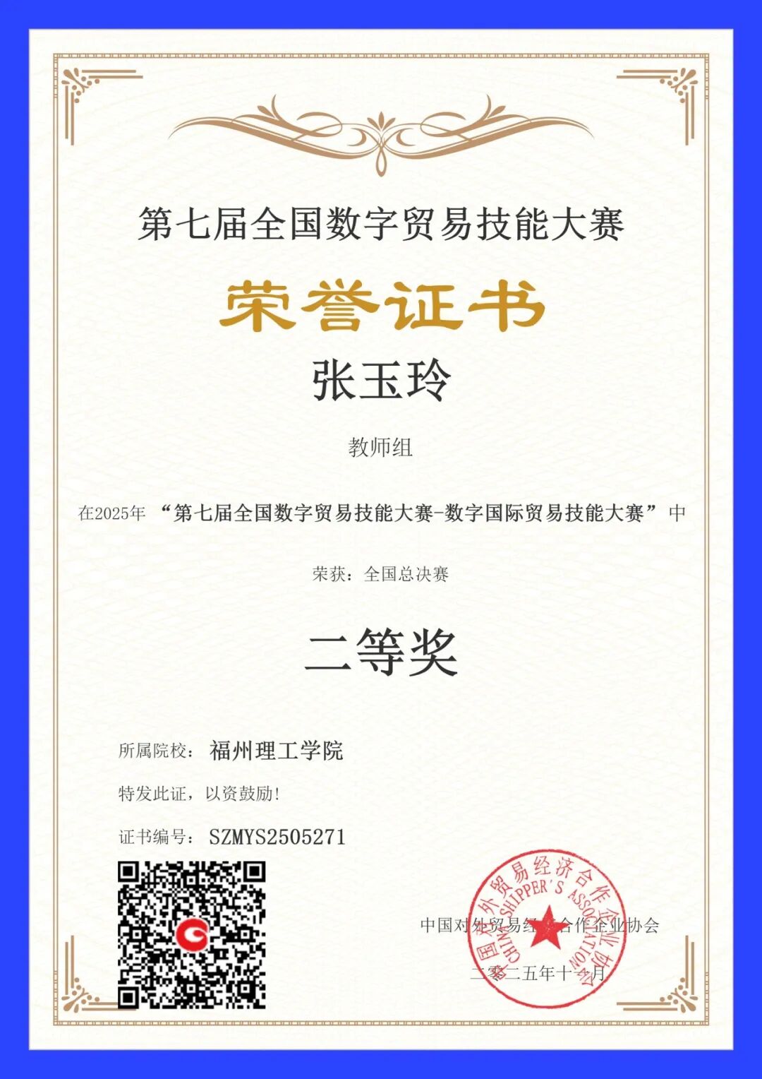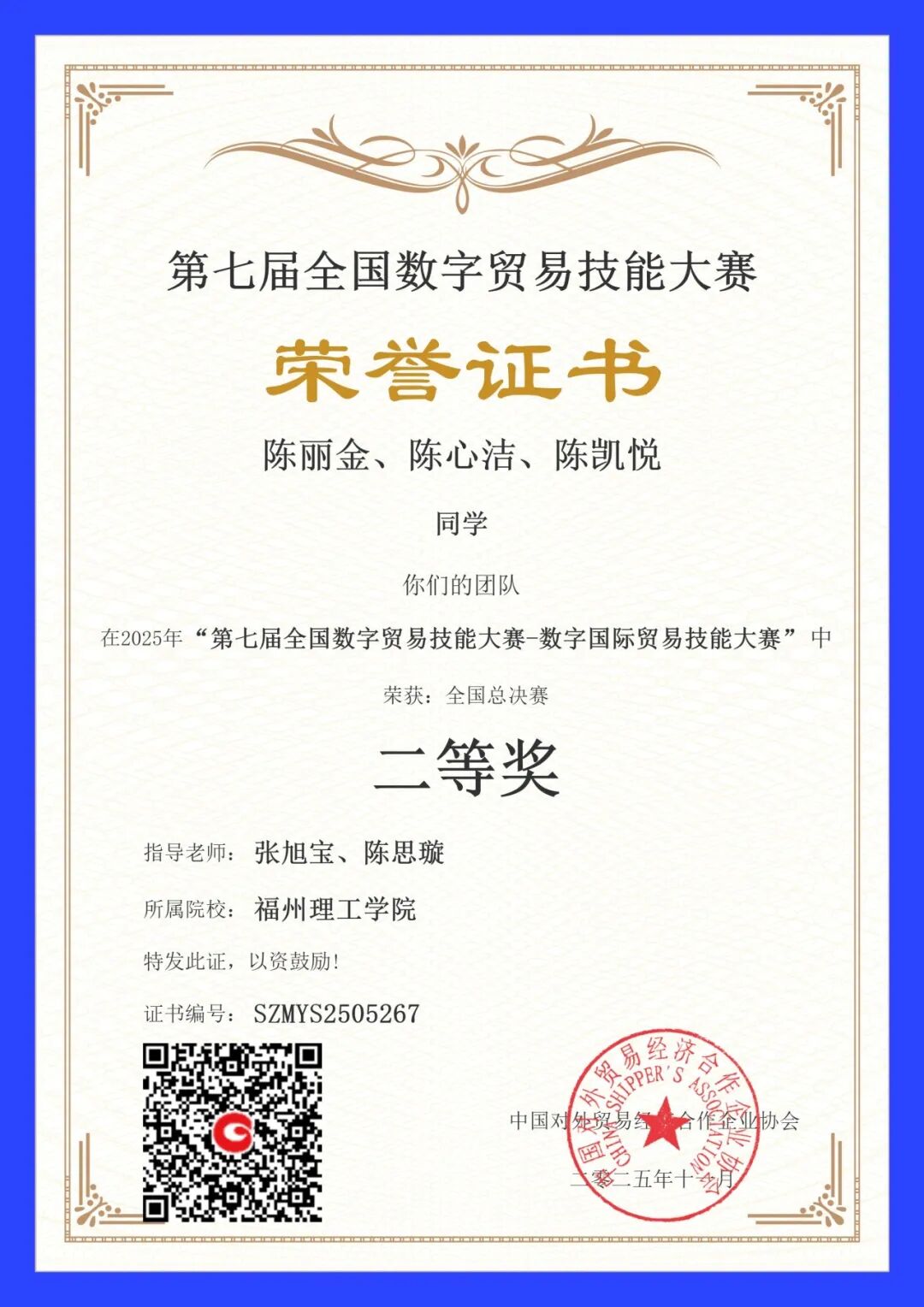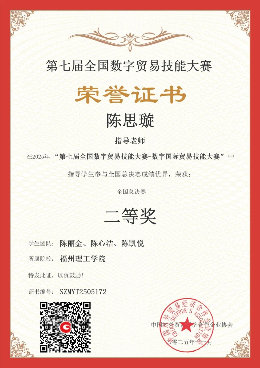 近日,第七届全国数字贸易技能大赛——国际贸易技能赛项国赛圆满落幕,福州理工学院经济管理学院团队共荣获本科学生组团队一等奖2个、二等奖2个,教师组个人二等奖1个,其中2024级国际经济与贸易专业学生范鑫怡、纪湘怡、郑韩冰团队以优异表现跻身全国第六名。