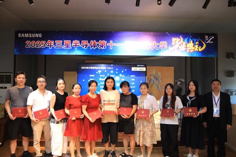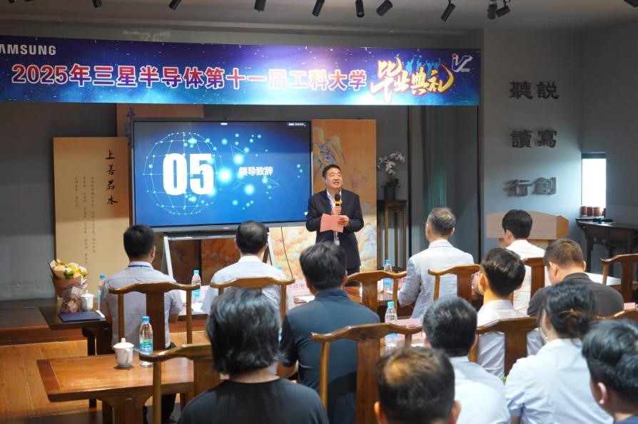 王应海在讲话中,向获得学历提升的39位专科毕业生和97位本科毕业生表示祝贺,他寄语学员们:永葆终身学习热情,以工匠精神追求卓越,把课堂所学转化为产线动能。他也充分肯定三星半导体工科大学打造产业“人才链”的成效,并代表学校向SESS长期深耕产学研、赋能人才链的战略担当表示感谢。