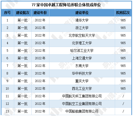 在教育部、国务院国资委等部门的大力支持下,77家高校、企业、研究院、国家实验室和行业协会共同组建中国卓越工程师培养联合体,其中包含42所高校、22家企业、7家实验室、5所研究院、1个行业协会。