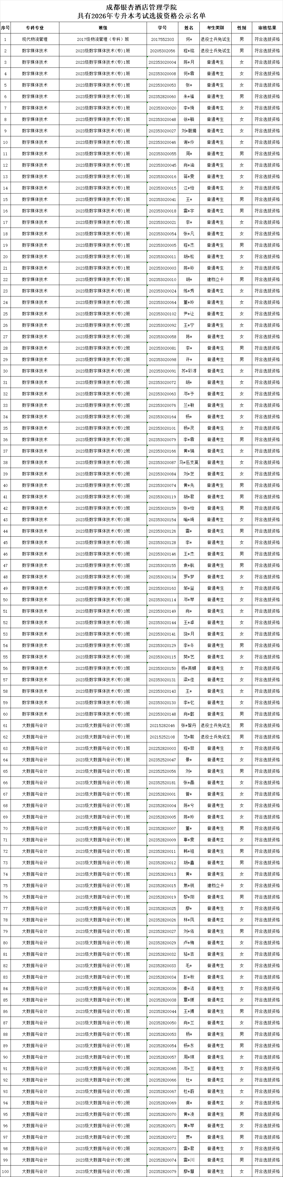 附件1:成都银杏酒店管理学院具有2026年专升本考试选拔资格公示名单