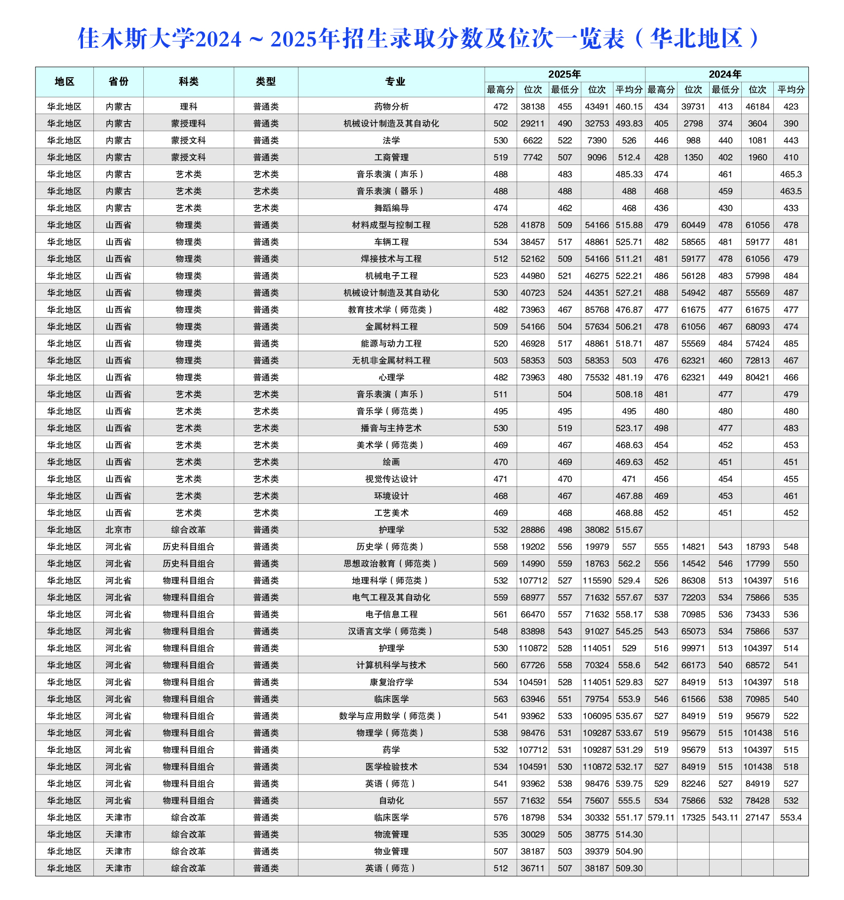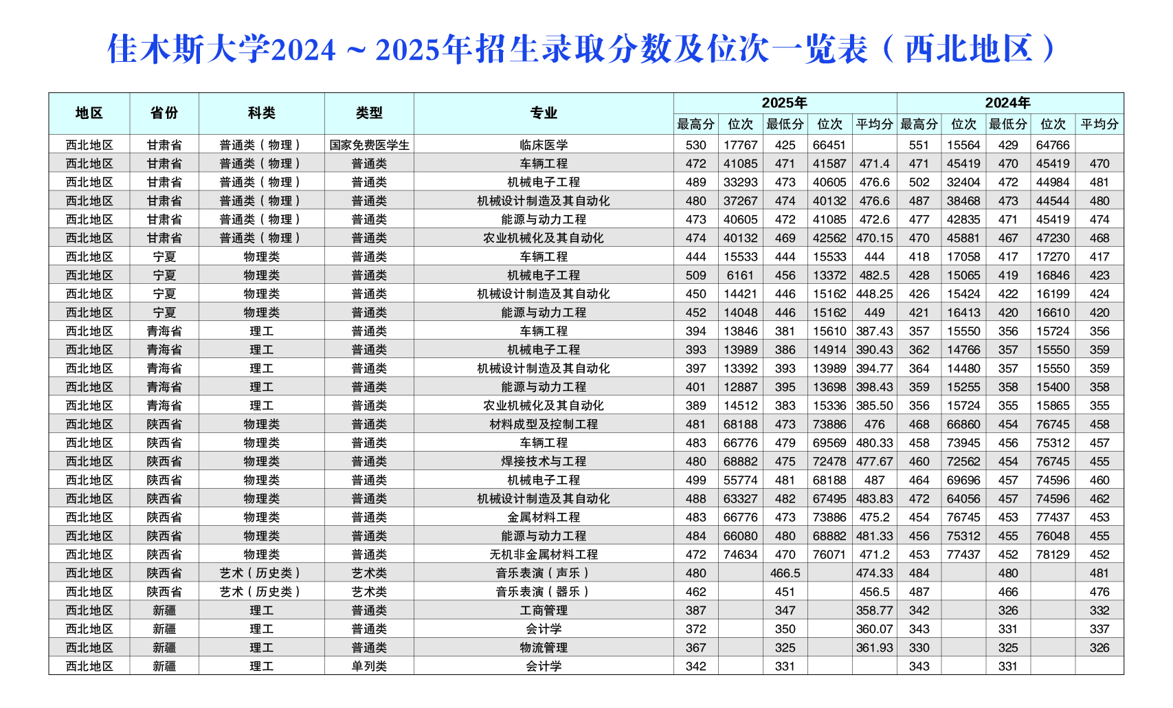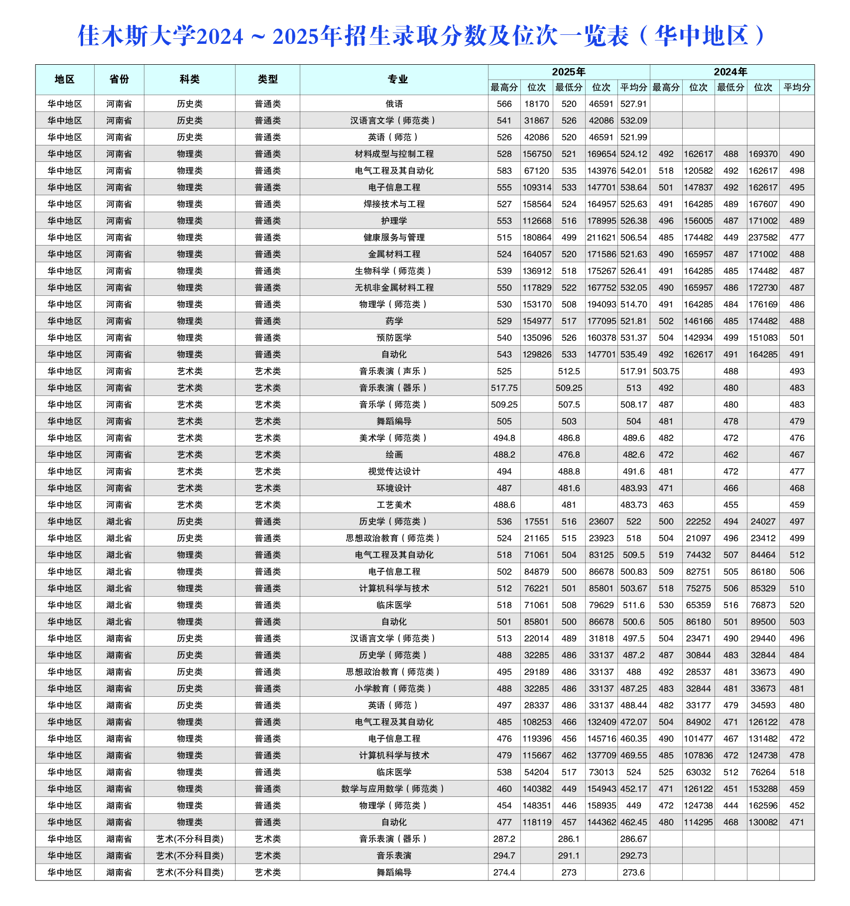 佳木斯大学2024~2025年招生录取分数及位次一览表