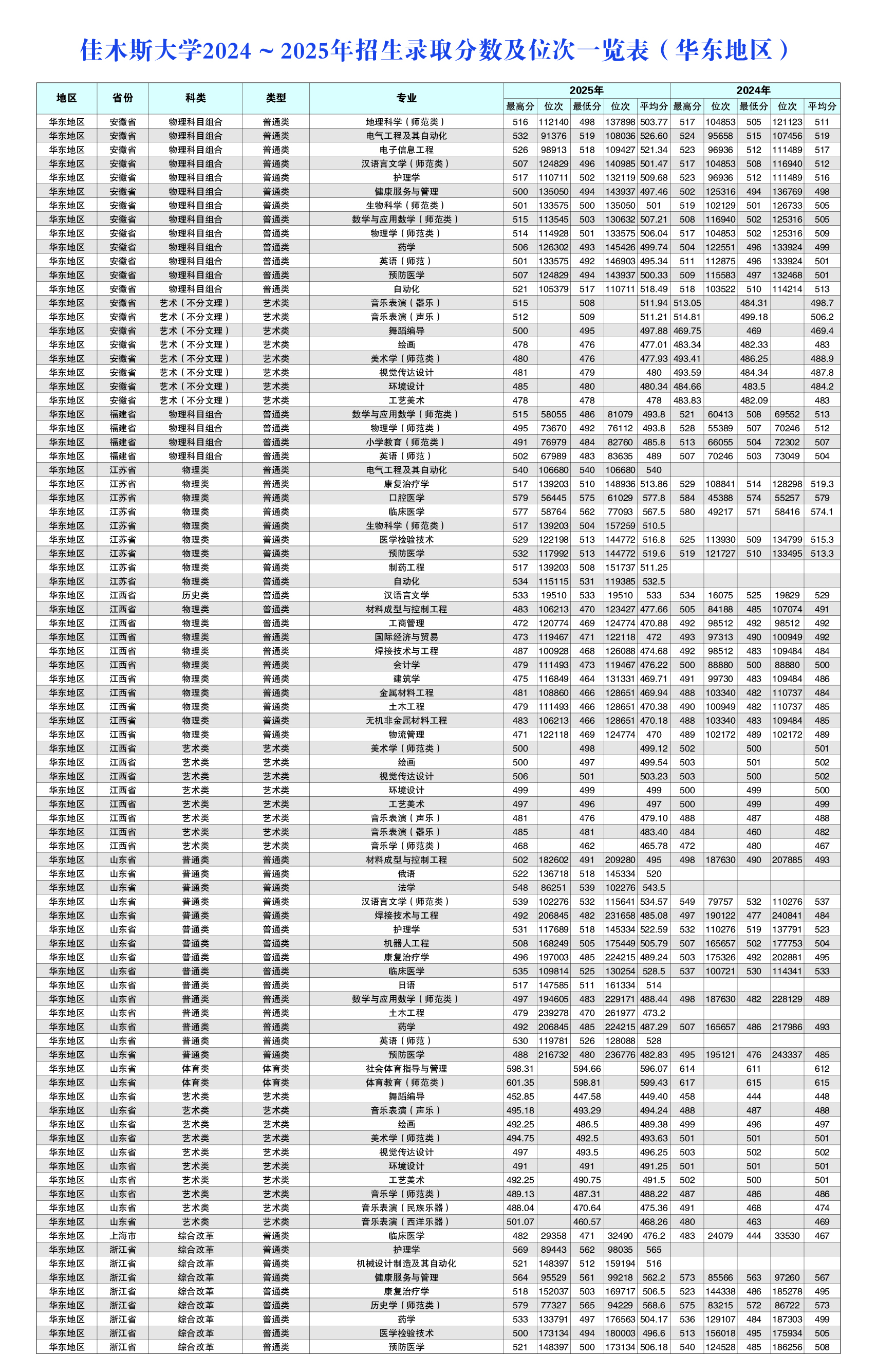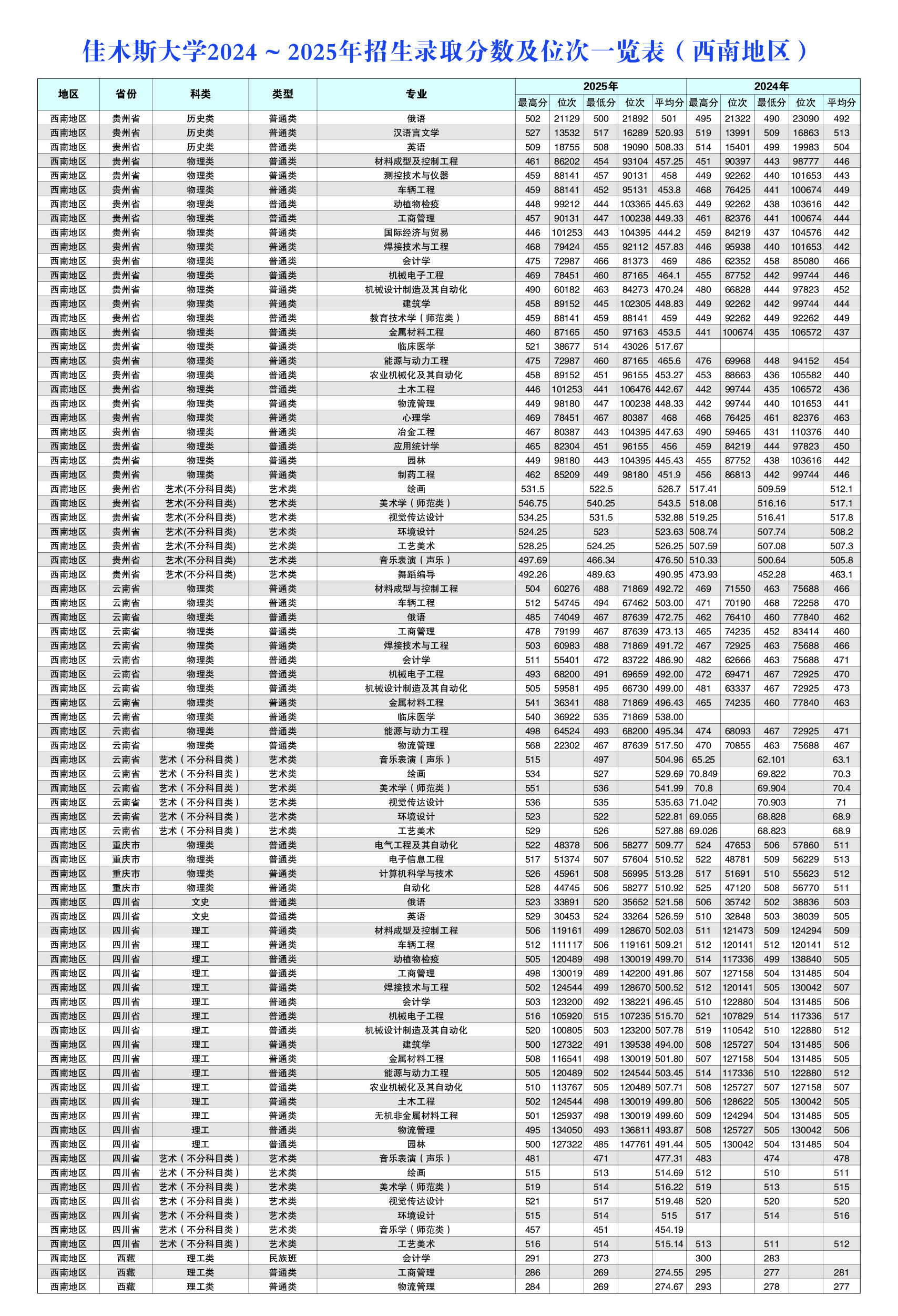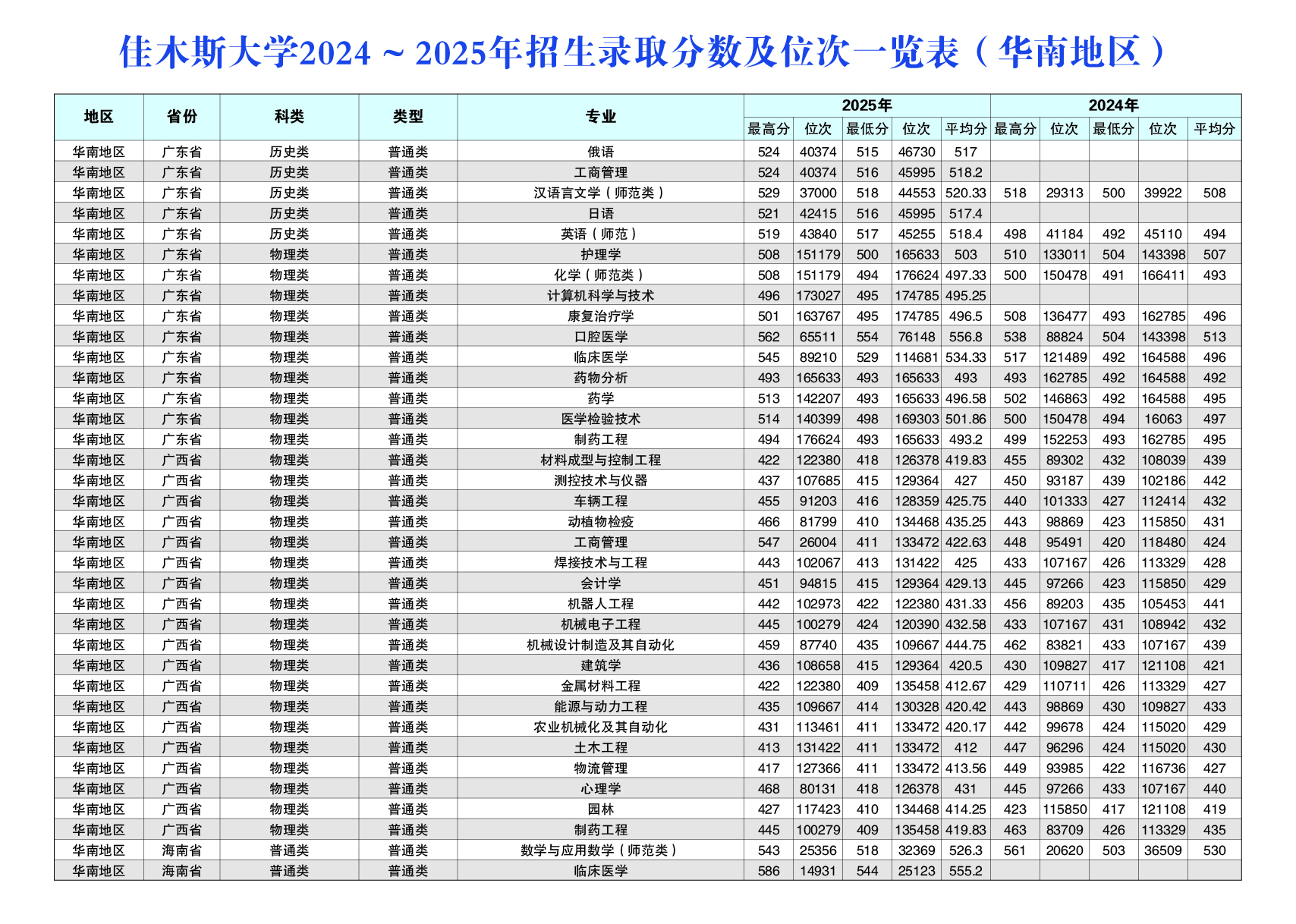 佳木斯大学2024~2025年招生录取分数及位次一览表