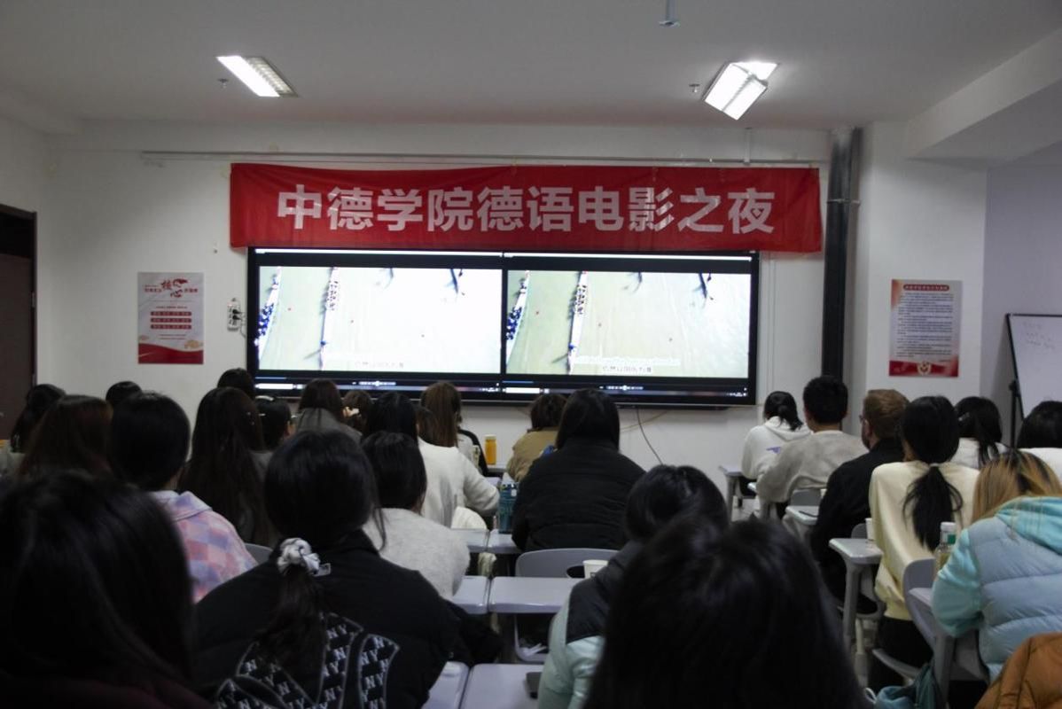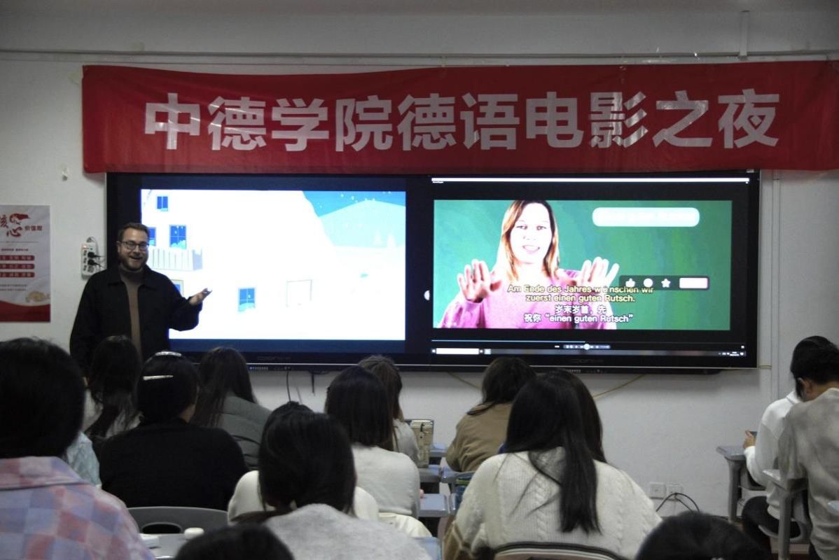 12月18日晚,中德学院第八期电影之夜活动在博学楼727教室举行。本期活动以“新年茶话会”为主题,将德语语言学习、德国文化体验与温馨的新年展望融为一体,为中德学子们打造了一个充满知识与温情的美好夜晚。活动由中德德语老师精心组织带队,并特别邀请德方教师Lutz Legge和Janine Doan共同参与,师生齐聚一堂,在光影、音乐与交流中,提前感受了浓厚的新年氛围,深化了中德文化间的理解与友谊。