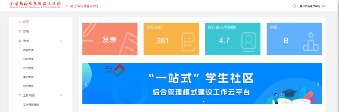 在教育部“一站式”学生社区综合管理模式建设评级中,连续三年荣获B级评定,跻身贵州省学生社区综合服务先进行列。我校“一站式”学生社区将党团组织、导师队伍、服务资源下沉到社区,建设集学习、交流、生活、服务功能于一体的社区空间,建成党员活动室13个,主题活动室3个,辅导员工作站2个,共享空间超600平米,打造学生“宜居、乐学、成长”的学生社区家园。