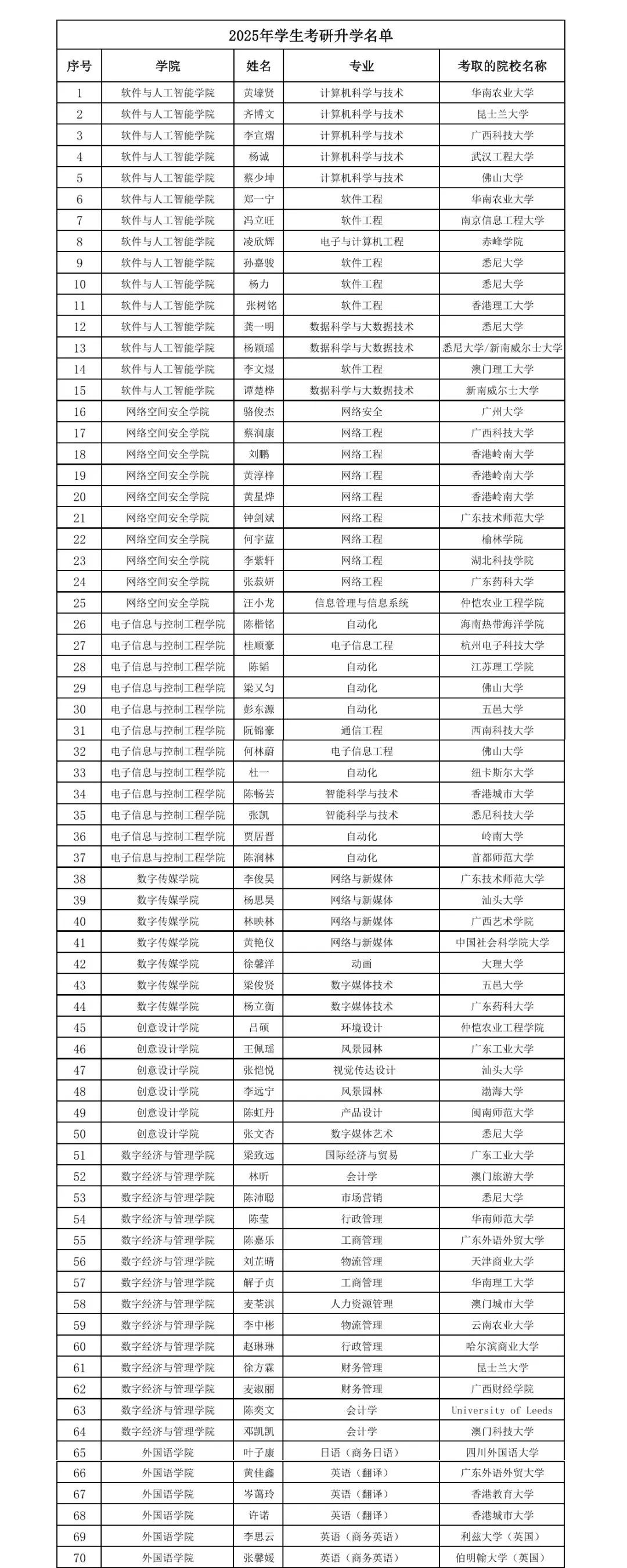 2025年我校共有72名毕业生考取硕士研究生,其中,40名毕业生考取国内知名高校,15名进入香港、澳门知名大学,17位获海外知名高校录取。