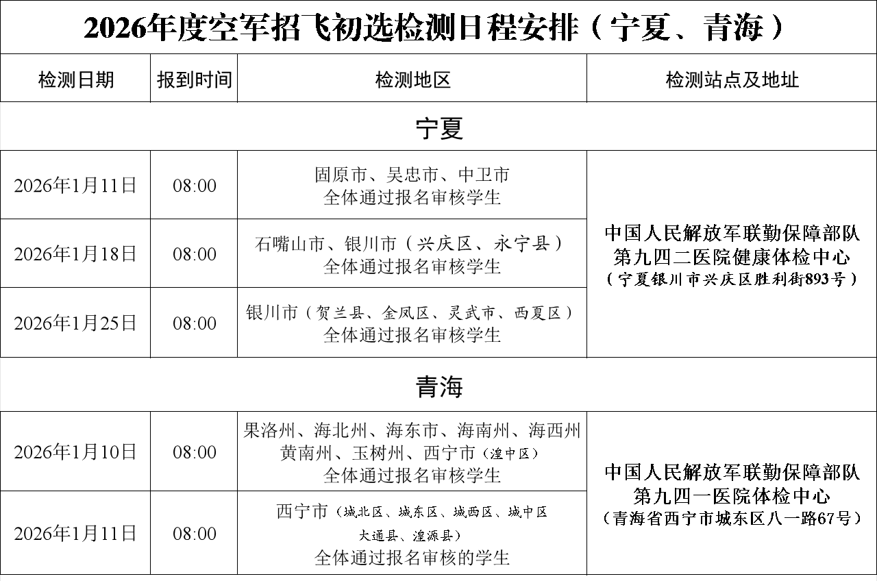 根据年度空军招飞工作安排,我部将于2026年1月开展宁夏、青海两省(区)2026年空军招飞初选检测工作。具体安排如下: