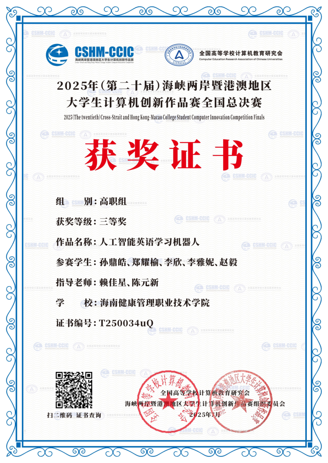 2025年第二十届海峡两岸暨港澳地区大学生计算机创新作品赛总决赛高职组三等奖