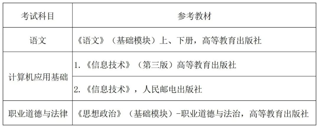 1.文化素质考试。文化素质考试采取笔试的考试方式,实行全省统一命题、统一考试、统一评卷,由省考试局负责组织实施。考试内容为我省中职学校所开设课程的基本知识,各科参考教材详见下表: