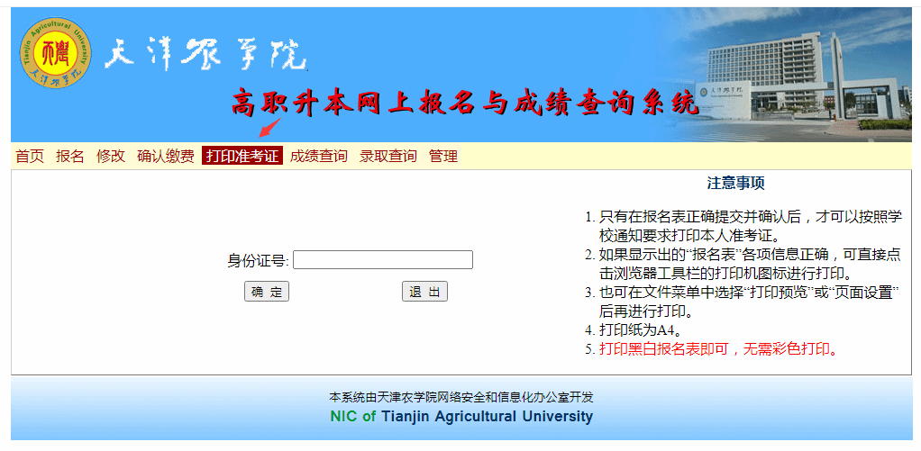 3.准考证打印地址:http://gzsb.tjau.edu.cn/,点击“打印准考证”,输入个人身份证号后即可打印准考证。