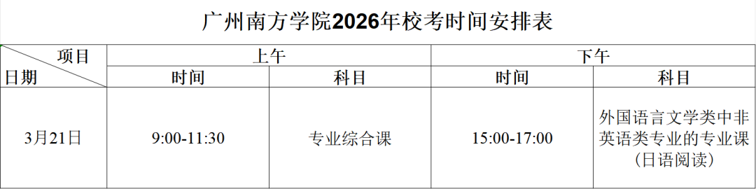 (五)外国语言文学类中非英语类专业的专业课,以及我校自行组织命题的专业综合课科目,由我校自行组织,考试时间为2026年3月21日,具体考场安排后续将以推文形式公布,请持续关注“广州南方学院招生办公室”微信公众号和“广州南方学院招生网”官网。