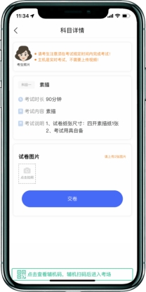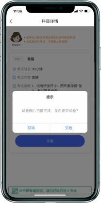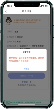 1、考试结束后考生立即停笔,请考生将试卷分别在主机和辅机监控镜头前进行展示确认,按远程监考员的指令在辅机的实时监控下,用主机“艺术升”APP拍摄完整的试卷照片上传(上传点击前务必确认照片清晰完整,若不清晰,可重拍后上传),须监考员确认符合要求后进行试卷密封。