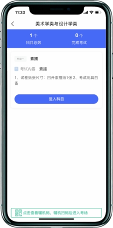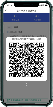 考生主机登录“艺术升”APP选择报考栏目,点击“网络考试”菜单,选择中国美术学院2026年本科招生(模拟考试)。待主机显示二维码后,用辅机打开“艺术升”APP(注意:辅机只打开“艺术升”主页,不要登录账号,使用首页右上角扫描工具“[-]”),扫码成功后辅机进入网络考试考场。只有辅机进入考场后,主机方可进入科目列表按系统提示进入该场考试。
