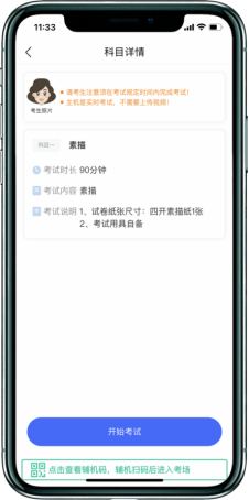 在进入正式考试前请仔细阅读“提示”信息,继续选择“开始考试”。如辅机在考试过程中网络异常中断,可点击主机本页的绿色区域,辅机扫码连接。
