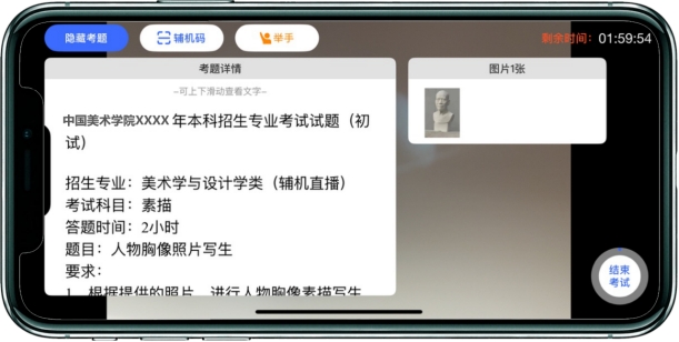 考生在考试作答过程中不得离开考场,不得有其他人员进入考场监考范围。考生如有问题可点击艺术升手机上的“举手”按钮,等待监考员发出询问指令后向监考员提问(提问不涉及考题相关内容)。考生若在考试中途离开即判定为答题终止,不得继续作画,如继续作答视为考试无效。