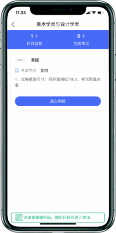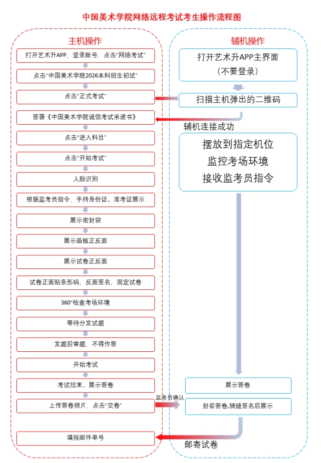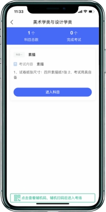 考生主机登录“艺术升”APP选择报考栏目,点击“网络考试”菜单,选择中国美术学院2026年本科招生(正式考试)。待主机显示二维码后,用辅机打开“艺术升”APP(注意:辅机只打开“艺术升”主页,不要登录账号,使用首页右上角扫描工具“[-]”),扫码成功后辅机进入网络考试考场。只有辅机进入考场后,主机方可进入科目列表按系统提示操作。