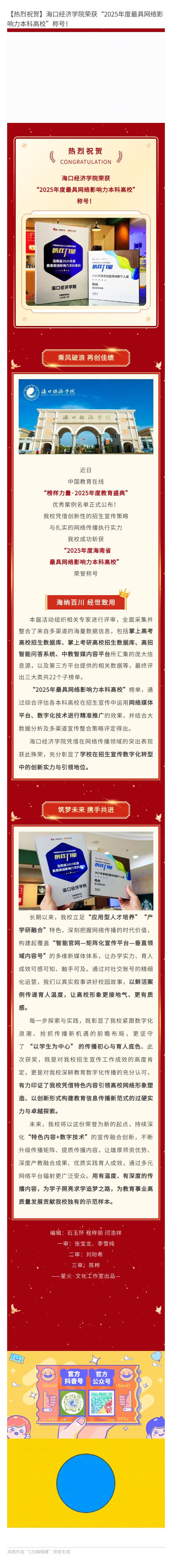 【热烈祝贺】海口经济学院荣获“2025年度最具网络影响力本科高校”称号!