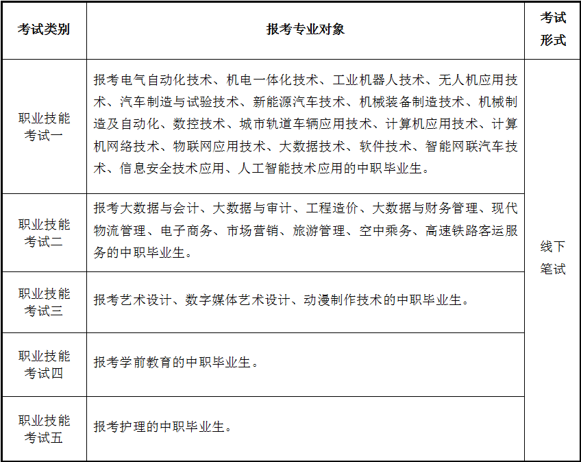 应往届中职毕业生参加职业技能考试,包括专业能力测试和技术技能测试。专业能力测试内容主要涵盖职业基本素养和综合专业能力;专业技能测试包括岗位技能、通用技术和专业素养等内容。主要采用开放性试题考查考生的书面表达、逻辑思维、应试能力、知识面、专业特长等职业素质、职业潜能和能力倾向等。专业能力测试和技术技能测试合卷进行笔试,总分300分,测试时间90分钟。考生按照报考我校的第一志愿进行划分,针对不同生源群体,参加相应职业技能考试。