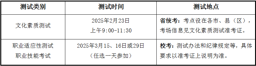 02入学测试办法分类考试招生实行“文化素质+职业技能”的考试评价方式。文化素质测试由省考试院统一组织。文化素质测试合格者,普通高中毕业生、具有高中阶段学历或同等学力及以上的社会人员参加我校组织的职业适应性测试;中职学校、中等技工学校等中等职业学校毕业生参加我校组织的职业技能考试。