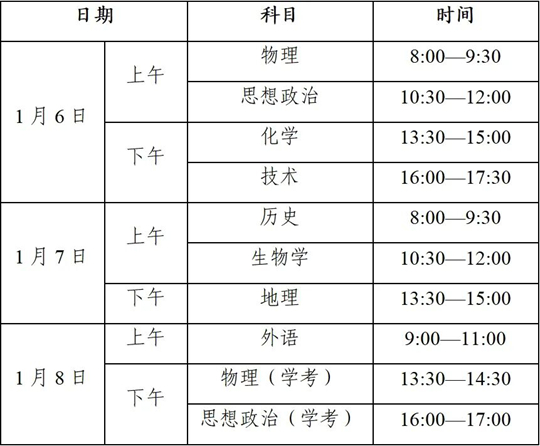 本次考试含高考外语、选考和高中学考。各科目考试时间如下: