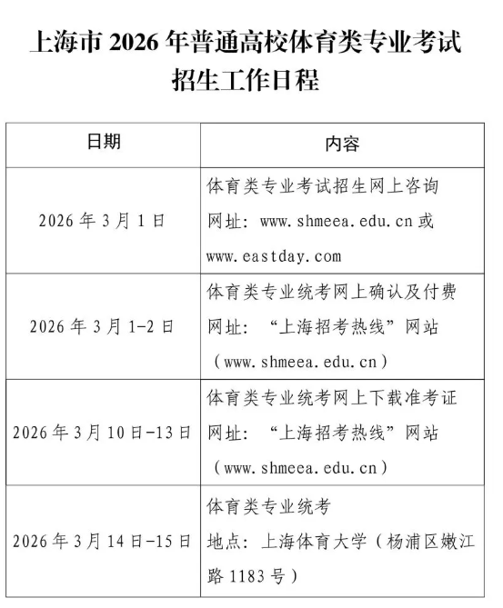 2026年1月初,考生可通过“上海招考热线”网站(www.shmeea.edu.cn)自行下载《上海市2026年普通高校考试招生体育类专业考生报考指南》,以便了解体育类专业考试招生相关信息及体育竞赛规则。
